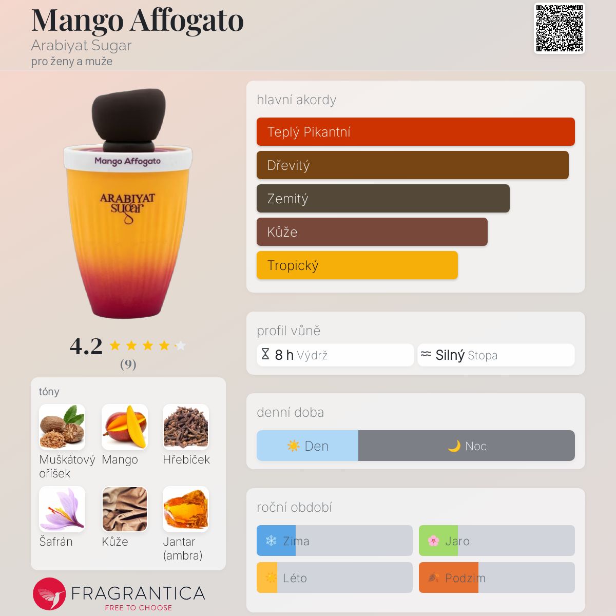 Mango Affogato podle Arabiyat Sugar je Orientální Spicy vůně pro ženy a muže. Toto je nová vůně. Mango Affogato byl/a uveden/a v roce 2025. "Nosem" za touto vůní je Ana Gomez. Vrchní tóny jsou Muškátový oříšek, Mango a Hřebíček; střední tóny jsouŠafrán, Kůže, Jantar (ambra) a Mech ; základní tóny jsou Dřevo akigala, Pačuli, Vetiver a Cypriolový olej.