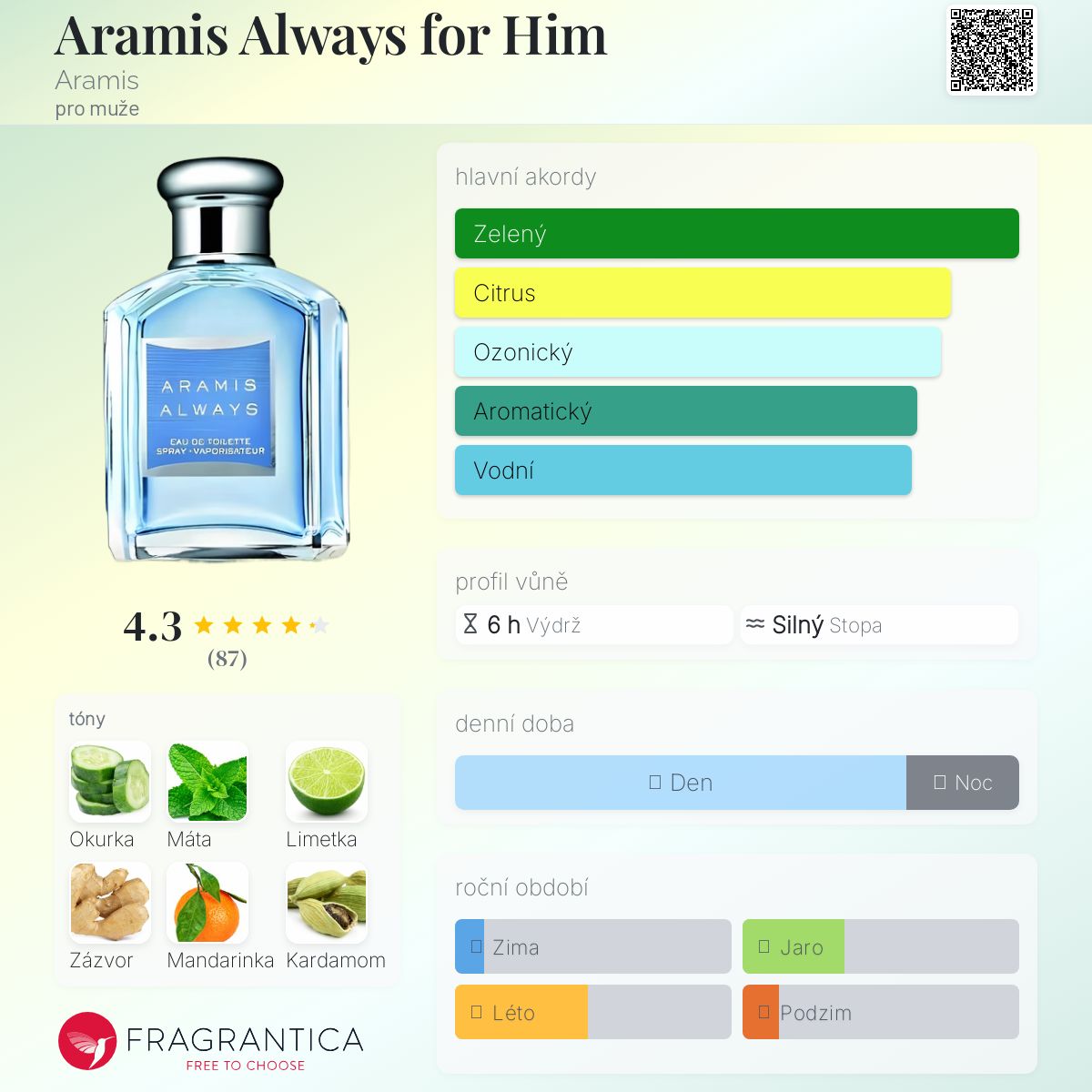 Aramis Always for Him podle Aramis je Woody Aquatic vůně pro muže. Aramis Always for Him byl/a uveden/a v roce 2006. Aramis Always for Him byl/a vytvořen/a Ilias Ermenidis a Jean Claude Delville. Vrchní tóny jsou Okurka, Limetka, Zázvor, Mandarinka a Skořice; střední tóny jsouMáta a Kardamom ; základní tóny jsou Vetiver, Jantar (ambra) a Cedr.