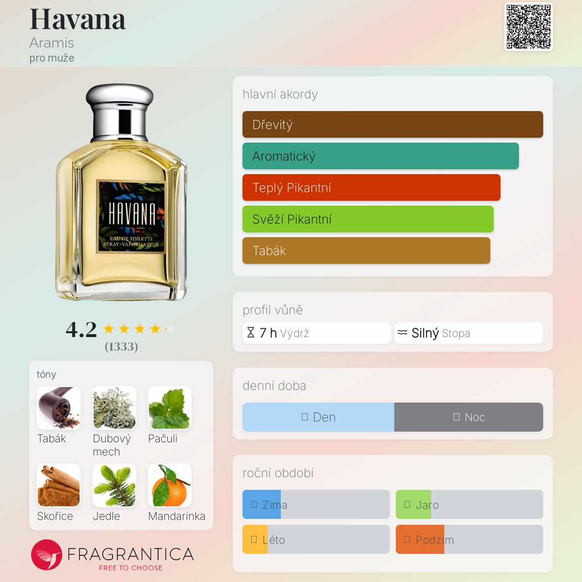 Havana podle Aramis je Orientální Spicy vůně pro muže. Havana byl/a uveden/a v roce 1994. Havana byl/a vytvořen/a Nathalie Feisthauer a Xavier Renard. Vrchní tóny jsou Mandarinka, Pelyněk, Bazalka a Kmín; střední tóny jsouTabák, Skořice, Jedle a Karafiát ; základní tóny jsou Dubový mech, Pačuli, Vetiver a Santalové dřevo.
