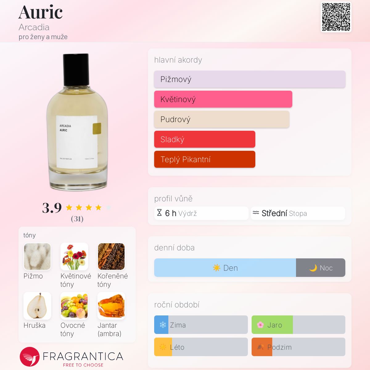 Auric podle Arcadia je Floral Fruity vůně pro ženy a muže. Auric byl/a uveden/a v roce 2021. Vrchní tón je Květinové tóny ; střední tóny jsouPižmo a Hruška ; základní tóny jsou Kořeněné tóny, Ovocné tóny a Jantar (ambra).