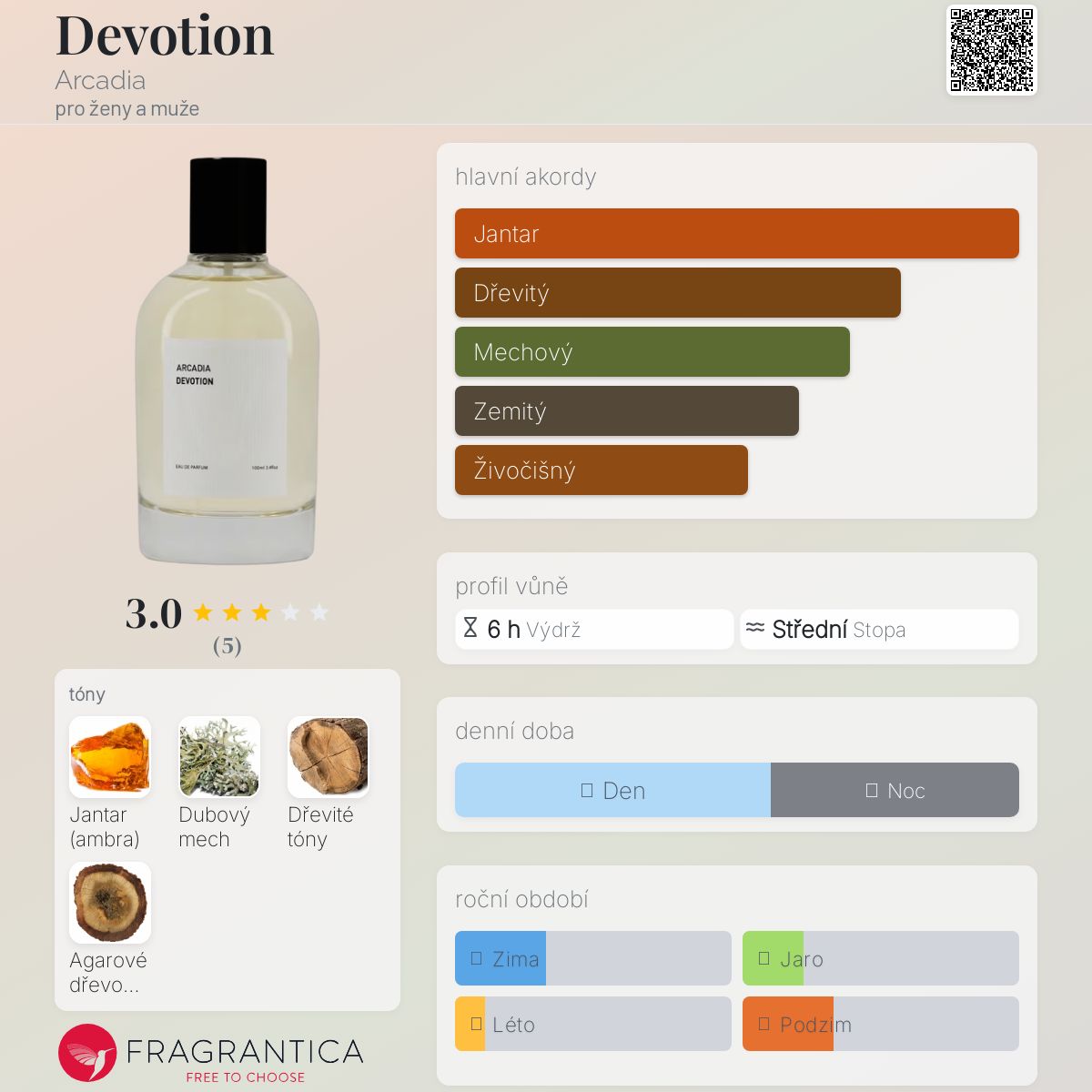 Devotion podle Arcadia je Orientální Woody vůně pro ženy a muže. Devotion byl/a uveden/a v roce 2022. Vrchní tón je Jantar (ambra) ; střední tón jeMech ; základní tóny jsou Dřevité tóny a Agarové dřevo (oud).