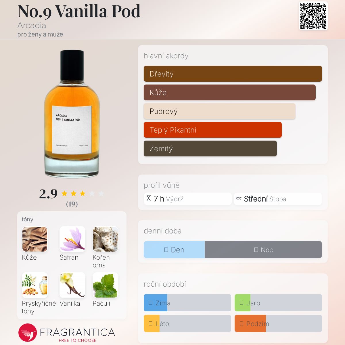 No.9 Vanilla Pod podle Arcadia je Orientální Spicy vůně pro ženy a muže. No.9 Vanilla Pod byl/a uveden/a v roce 2017. Vrchní tóny jsou Mandarinka a Vodní tóny; střední tóny jsouŠafrán, Kořen orris, Fialka, Jasmín, Černý pepř, Růže a Hřebíček ; základní tóny jsou Kůže, Pryskyřičné tóny, Vanilka, Pačuli, Vetiver, Labdanum, Cedr, Jantar (ambra) a Santalové dřevo.