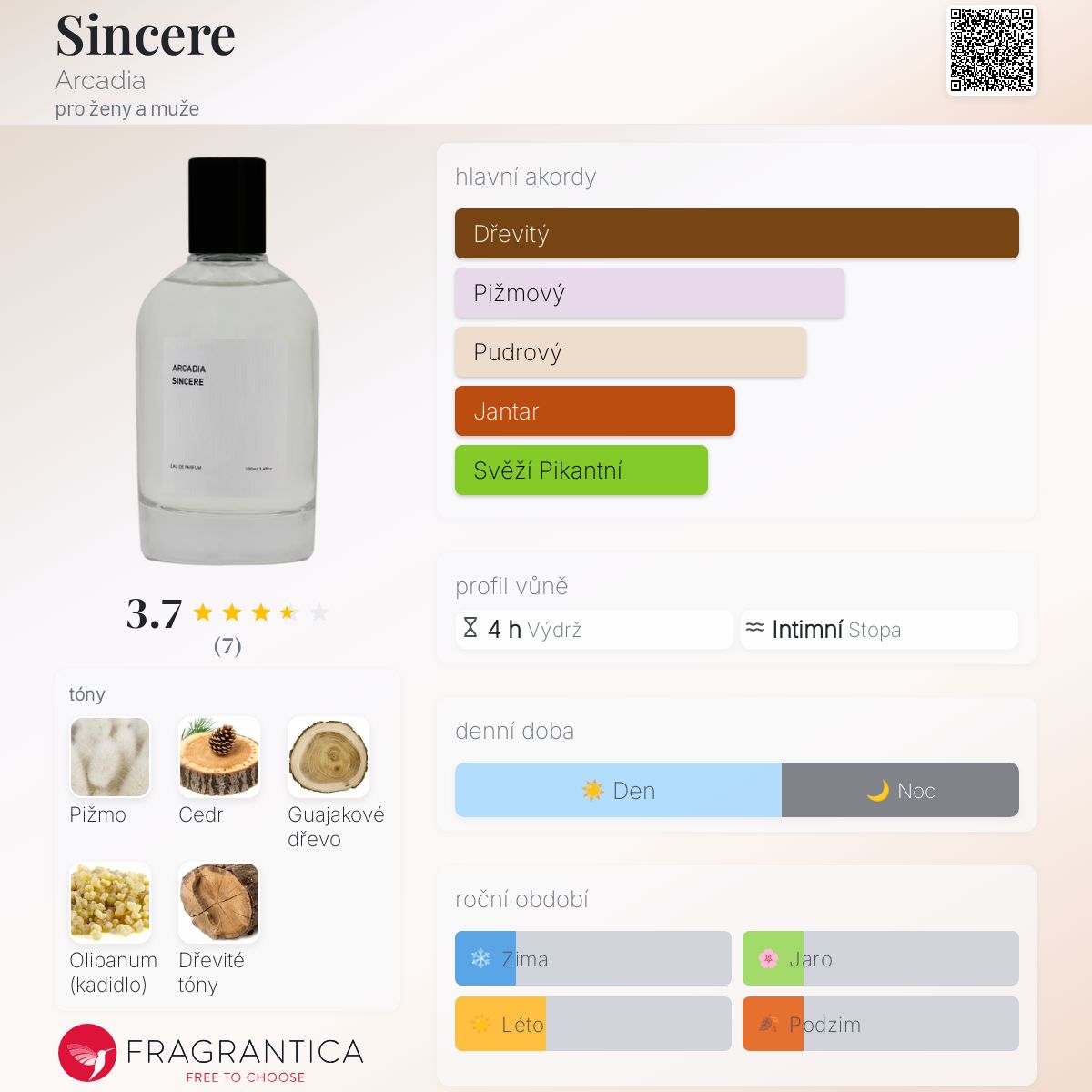 Sincere podle Arcadia je Woody vůně pro ženy a muže. Sincere byl/a uveden/a v roce 2022. Vrchní tóny jsou Pižmo a Guajakové dřevo; střední tóny jsouCedr a Olibanum ; základní tón je Dřevité tóny.