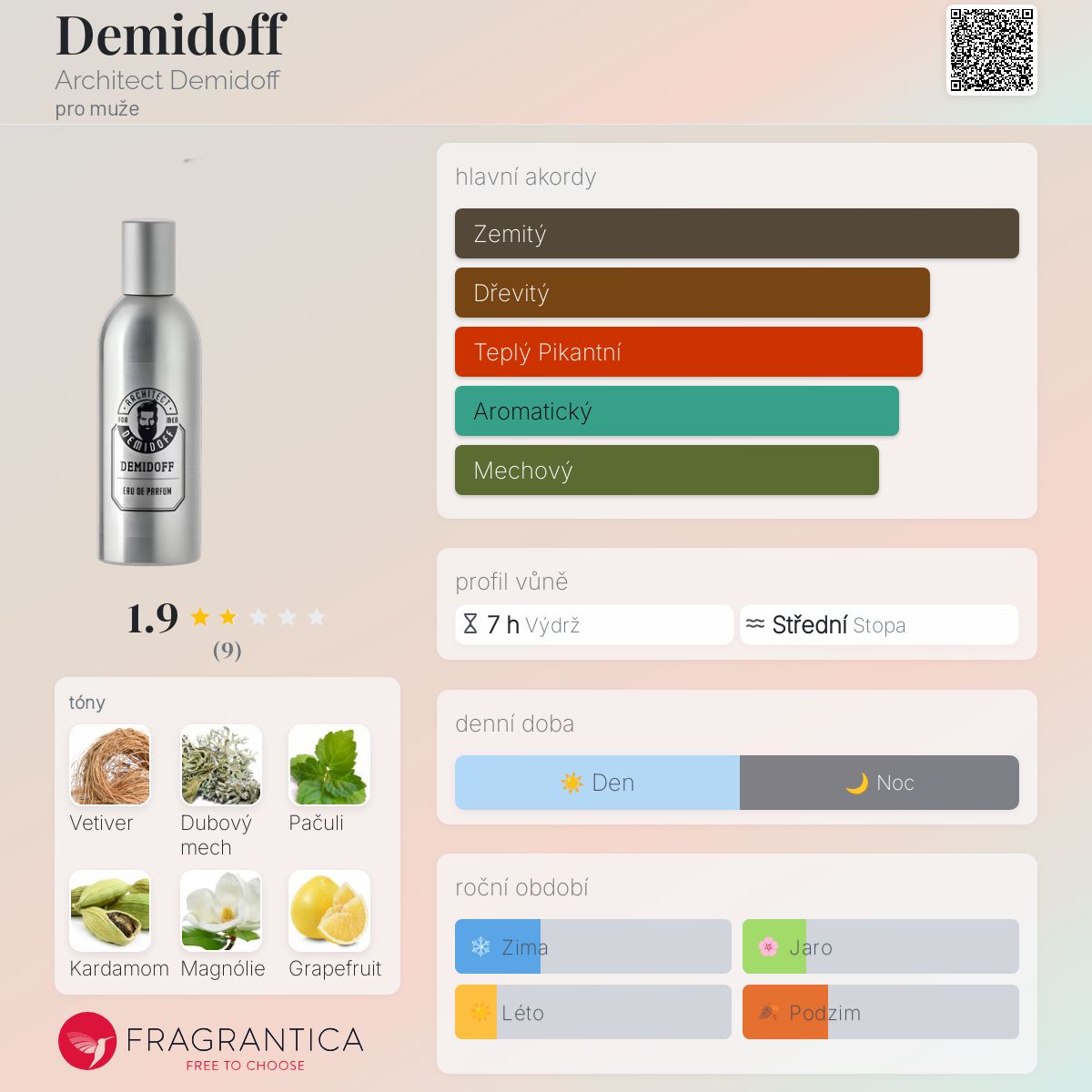Demidoff podle Architect Demidoff je Woody Aromatic vůně pro muže. Demidoff byla spuštěna během 2020. Vrchní tóny jsou Růžový grapefruit, Červené bobule, Bergamot a Citrón; střední tóny jsouKardamom, Magnólie, Jasmín, Černý pepř a Muškátový oříšek ; základní tóny jsou Vetiver, Mech, Pačuli, Vanilka a Cedr.