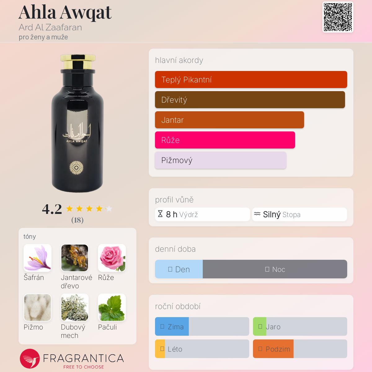 Ahla Awqat podle Ard Al Zaafaran je Aromatic Spicy vůně pro ženy a muže. Ahla Awqat byl/a uveden/a v roce 2021. Vrchní tóny jsou Šafrán, Zázvor, Mandarinka a Bergamot; střední tóny jsouJantarové dřevo, Růže, Pačuli a Jasmín ; základní tóny jsou Bílé pižmo, Dubový mech, Santalové dřevo a Vanilka.