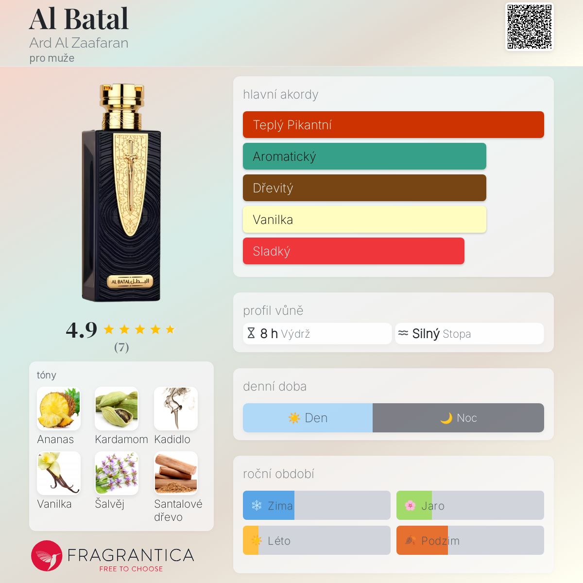 Al Batal podle Ard Al Zaafaran je Orientální Spicy vůně pro muže. Vrchní tóny jsou Ananas a Kardamom; střední tóny jsouKadidlo, Vanilka a Šalvěj ; základní tóny jsou Santalové dřevo, Fazole tonka a Pačuli.