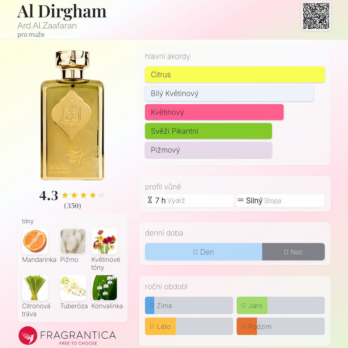 Al Dirgham podle Ard Al Zaafaran je Floral vůně pro muže. Al Dirgham byl/a uveden/a v roce 2023. Vrchní tóny jsou Mandarinka, Citronová tráva a Pelargónie; střední tóny jsouTuberóza, Konvalinka, Jasmín, Růže, Hřebíček a Skořice ; základní tóny jsou Pižmo, Květinové tóny, Fazole tonka a Vanilka.