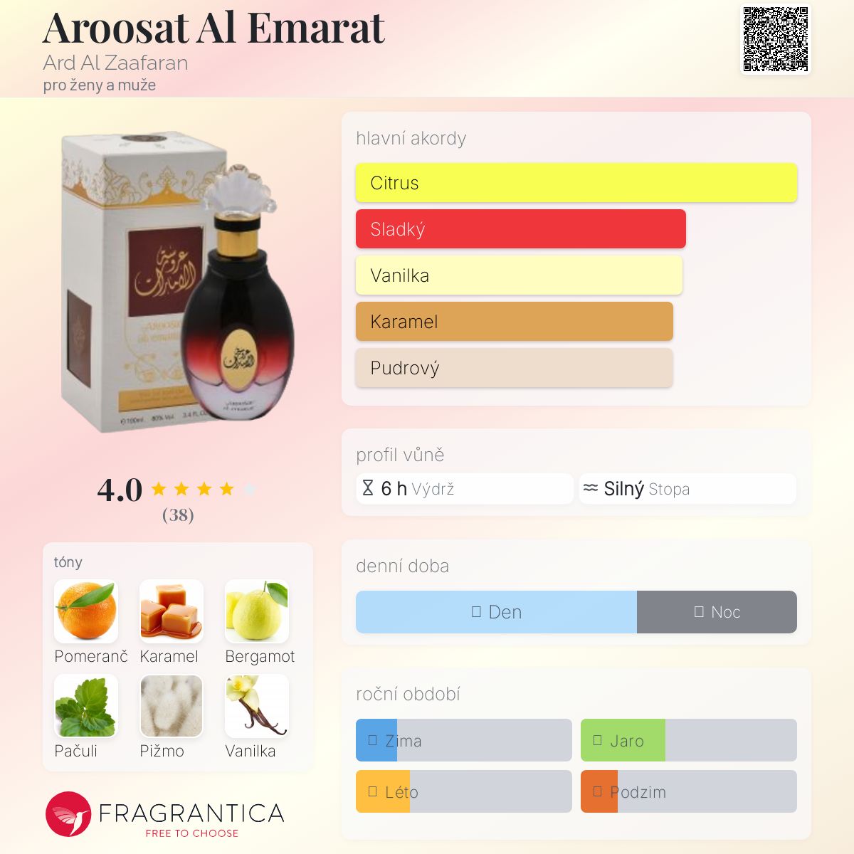 Aroosat Al Emarat podle Ard Al Zaafaran je Orientální Floral vůně pro ženy a muže. Vrchní tóny jsou Pomeranč a Bergamot; střední tóny jsouPačuli, Kosatec, Růže, Jasmín a Vetiver ; základní tóny jsou Karamel, Pižmo, Vanilka, Fazole tonka a Agarové dřevo (oud).