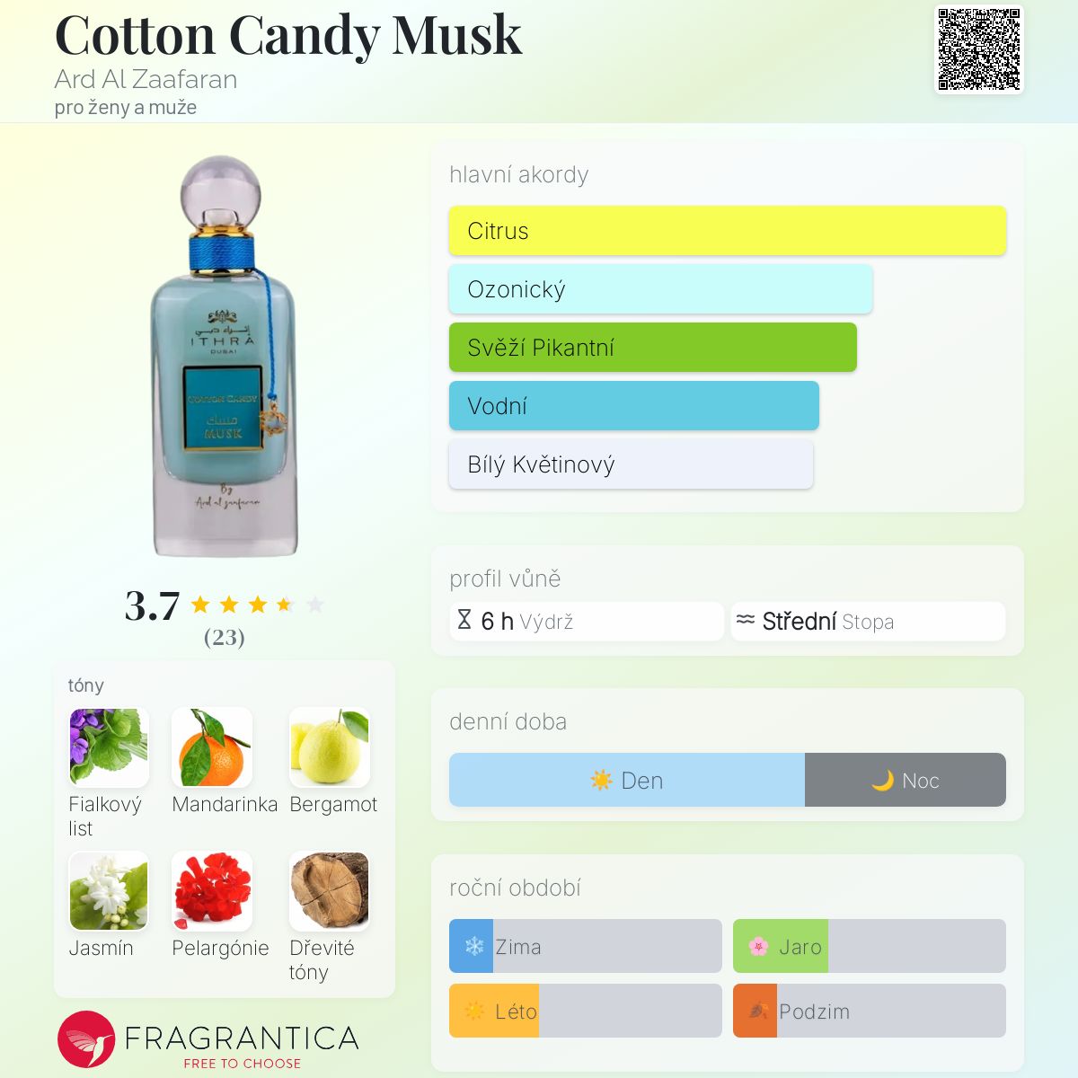 Cotton Candy Musk podle Ard Al Zaafaran je Floral Woody Musk vůně pro ženy a muže. Cotton Candy Musk byl/a uveden/a v roce 20. Vrchní tóny jsou Mandarinka, Bergamot a Pelargónie; střední tóny jsouFialkové listy a Jasmín ; základní tón je Dřevité tóny.