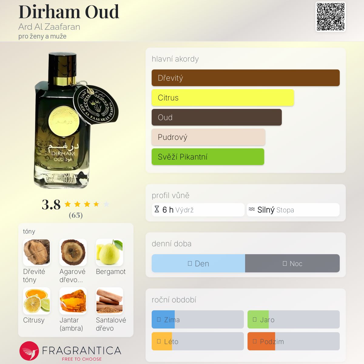 Dirham Oud podle Ard Al Zaafaran je Orientální Woody vůně pro ženy a muže. Dirham Oud byl/a uveden/a v roce 2021. Vrchní tóny jsou Bergamot, Citrusy a Maliny; střední tóny jsouSantalové dřevo, Růže a Levandule ; základní tóny jsou Dřevité tóny, Agarové dřevo (oud), Jantar (ambra), Cedr a Bílé pižmo.