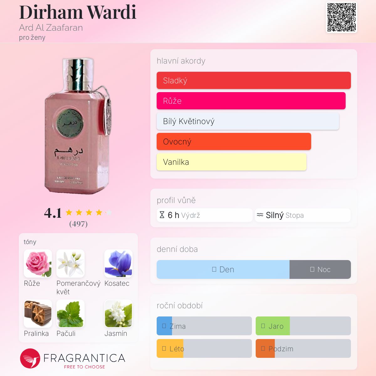 Dirham Wardi podle Ard Al Zaafaran je vůně pro ženy. Vrchní tóny jsou Růže, Pomerančový květ, Hruška a Černý rybíz; střední tóny jsouKosatec, Pralinka a Jasmín ; základní tóny jsou Pačuli, Vanilka a Fazole tonka.