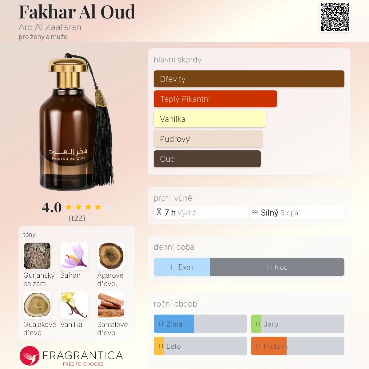 Fakhar Al Oud podle Ard Al Zaafaran je Woody Spicy vůně pro ženy a muže. Fakhar Al Oud byl/a uveden/a v roce 2021. Vrchní tóny jsou Šafrán, Agarové dřevo (oud), Cypriolový olej a Muškátový oříšek; střední tóny jsouGurjanský balzám, Guajakové dřevo, Santalové dřevo, Cedr, Pačuli a Jasmín ; základní tóny jsou Vanilka, Jantar (ambra), Fazole tonka a Pižmo.