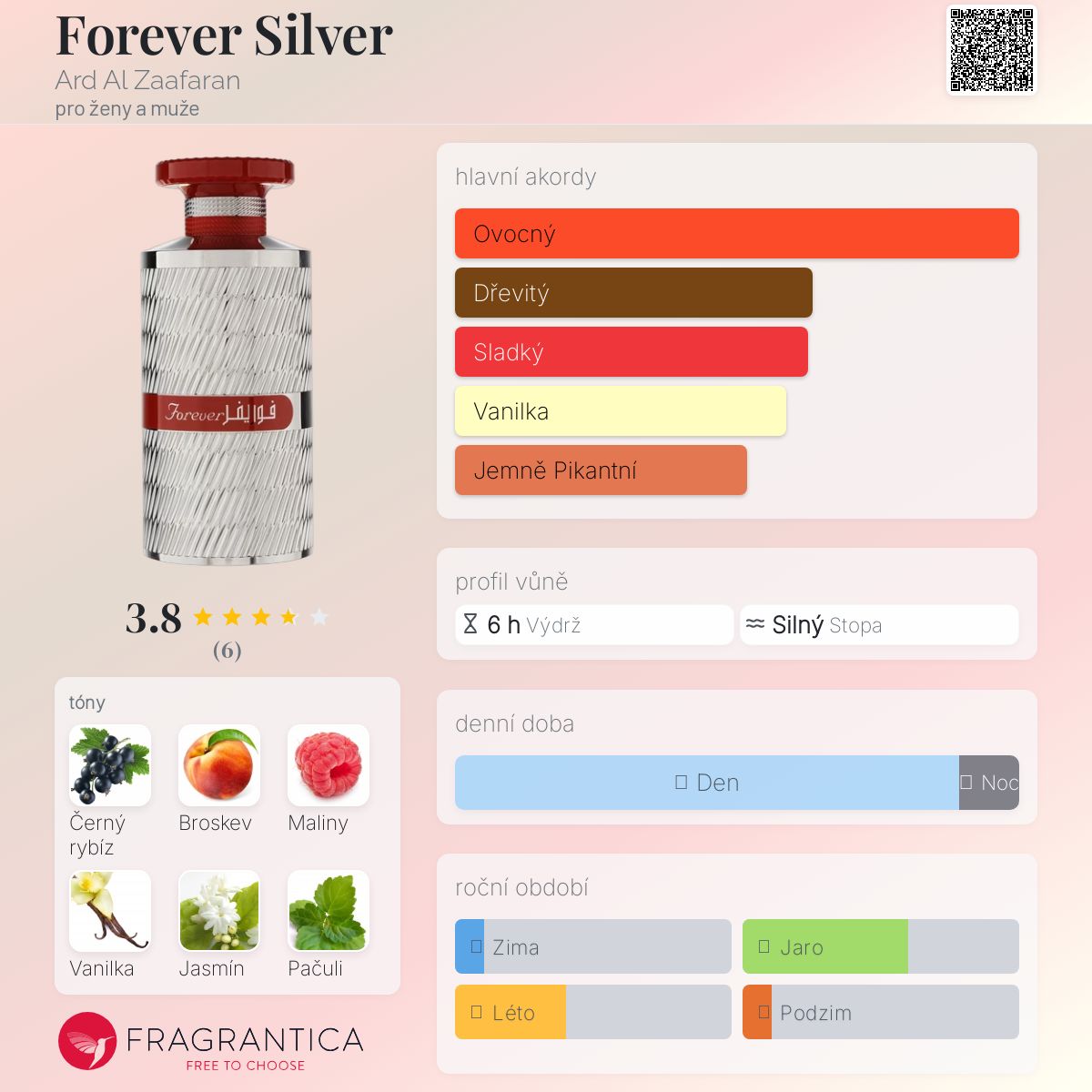 Forever Silver podle Ard Al Zaafaran je Floral Fruity Gourmand vůně pro ženy a muže. Forever Silver byl/a uveden/a v roce 2024. Vrchní tóny jsou Černý rybíz a Broskev; střední tóny jsouMaliny a Jasmín ; základní tóny jsou Vanilka, Pačuli a Cedr.