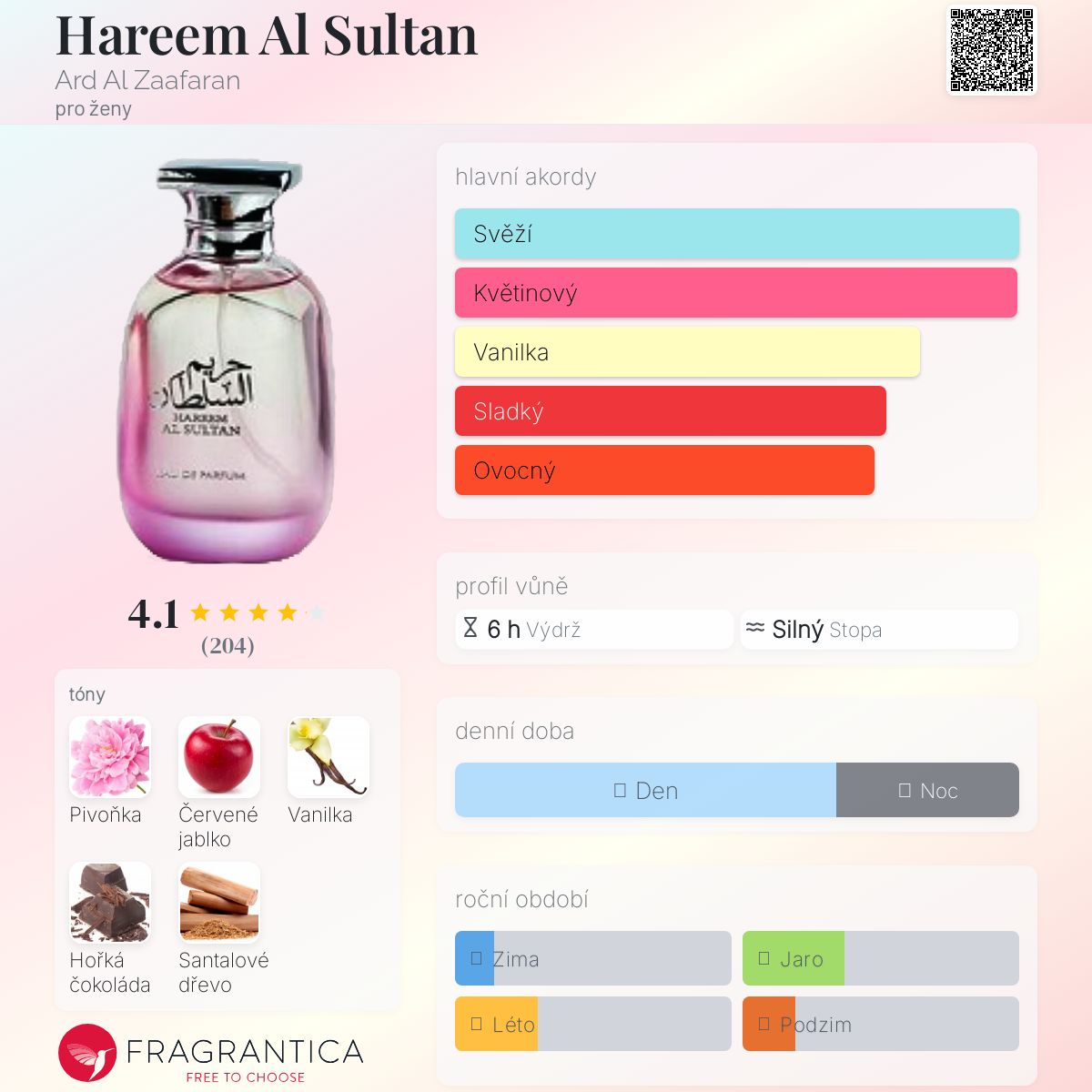 Hareem Al Sultan podle Ard Al Zaafaran je vůně pro ženy. Vrchní tóny jsou Červené jablko a Hořká čokoláda; střední tón jePivoňka ; základní tóny jsou Vanilka a Santalové dřevo.
