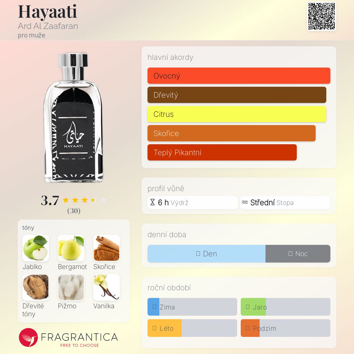 Hayaati podle Ard Al Zaafaran je Aromatic vůně pro muže. Toto je nová vůně. Hayaati byl/a uveden/a v roce 2022. Vrchní tóny jsou Jablko a Bergamot; střední tóny jsouSkořice a Dřevité tóny ; základní tóny jsou Pižmo a Vanilka.