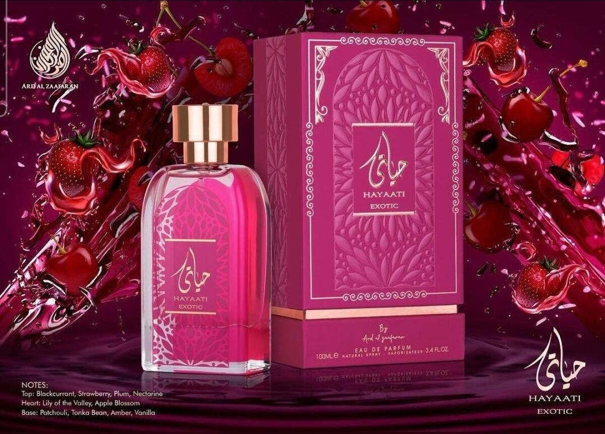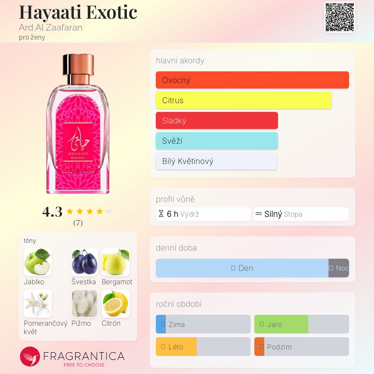 Hayaati Exotic podle Ard Al Zaafaran je vůně pro ženy. Toto je nová vůně. Hayaati Exotic byl/a uveden/a v roce 2025. Vrchní tóny jsou Jablko, Sicilský bergamot, Italský citrón a Badyán; střední tóny jsouŠvestka, Pomerančový květ a Kardamom ; základní tón je Pižmo.
