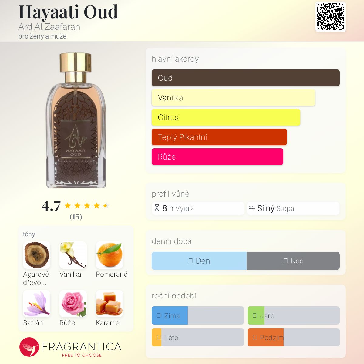 Hayaati Oud podle Ard Al Zaafaran je Floral Fruity Gourmand vůně pro ženy a muže. Hayaati Oud byl/a uveden/a v roce 2022. Vrchní tóny jsou Pomeranč a Šafrán; střední tóny jsouRůže, Karamel a Tuberóza ; základní tóny jsou Agarové dřevo (oud) a Vanilka.