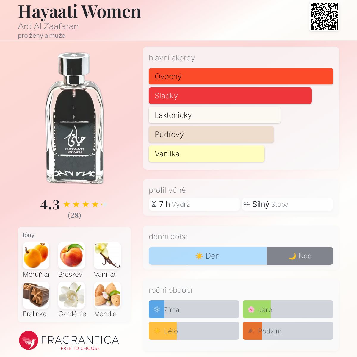 Hayaati Women podle Ard Al Zaafaran je Floral Fruity vůně pro ženy a muže. Hayaati Women byl/a uveden/a v roce 2021. Vrchní tóny jsou Zelená mandle a Jasmín; střední tóny jsouPralinka, Gardénie a Lékořice ; základní tóny jsou Meruňka, Broskev, Vanilka a Santalové dřevo.