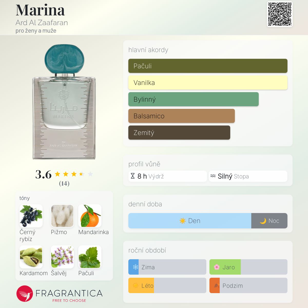 Marina podle Ard Al Zaafaran je Aromatic Aquatic vůně pro ženy a muže. Marina byl/a uveden/a v roce 2023. Vrchní tóny jsou Černý rybíz a Zelená mandarinka; střední tóny jsouKardamom a Šalvěj ; základní tóny jsou Pižmo, Pačuli a Vanilka.