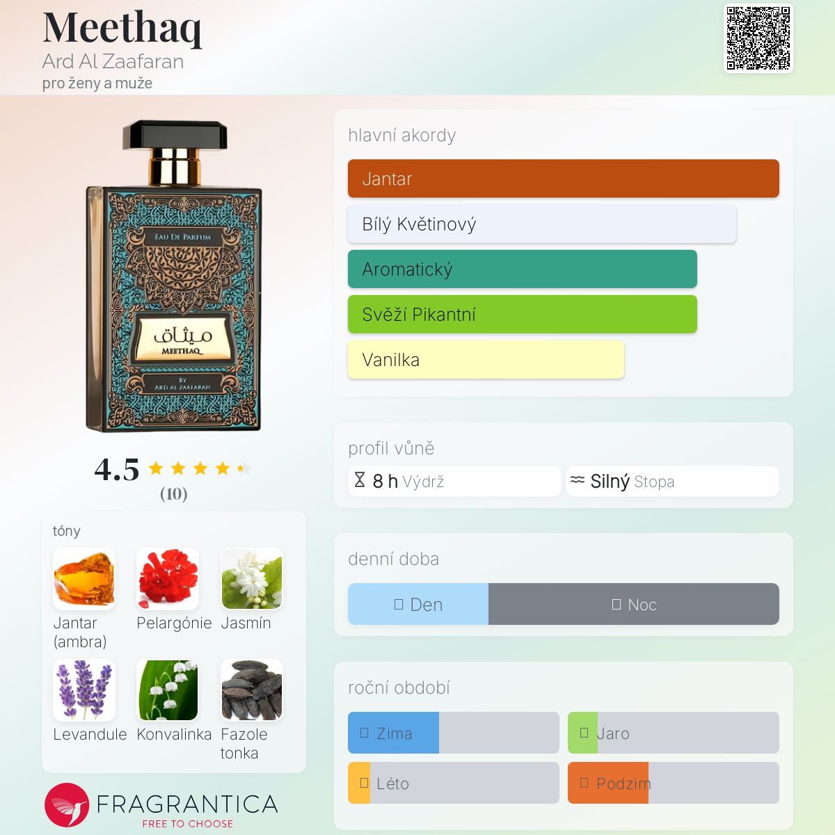 Meethaq podle Ard Al Zaafaran je Orientální Fougere vůně pro ženy a muže. Vrchní tóny jsou Levandule a Bergamot; střední tóny jsouPelargónie, Jasmín a Konvalinka ; základní tóny jsou Jantar (ambra), Fazole tonka, Pačuli a Vanilka.