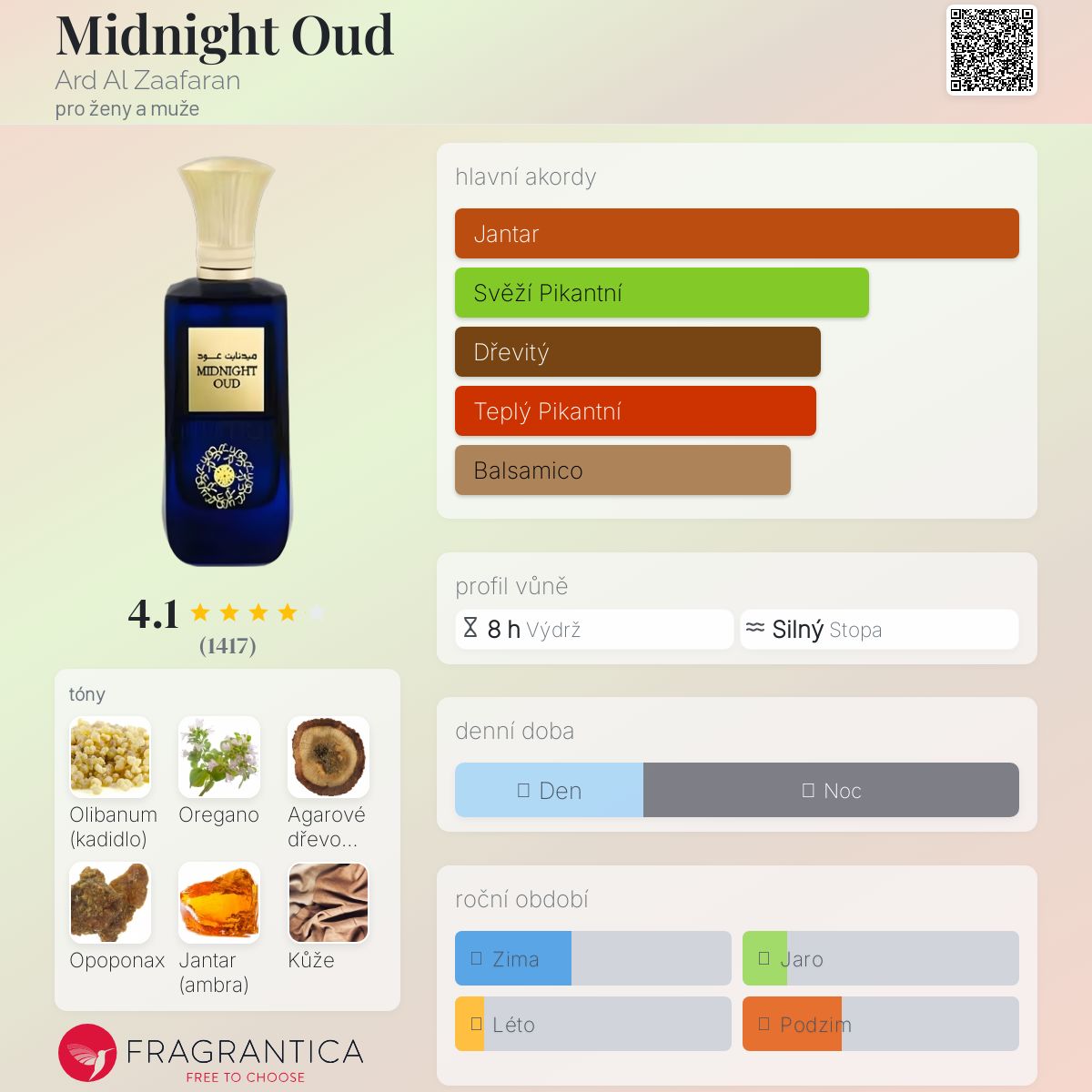 Midnight Oud od Ard Al Zaafaran je impozantní, majestátní, mocná jako její inspirace, ukutá v srdci arabského království, přináší s sebou veškerou magii tohoto světa, její srdce hoří kadidlem a božským oudem, jantarem a lehce kořeněnou kůží. Kouzelná a krásná. Flakon je krásný, i když mi na něm nezáleží, a balení je nádherné. Její výkon je jako výkon arabského hřebce, který přechází Saharu v písečné bouři a promítá na mou kůži celou dobu své dlouhé, více než desetihodinové životnosti.