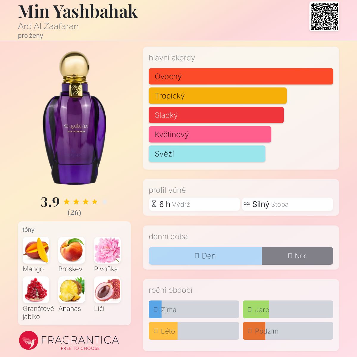 Min Yashbahak podle Ard Al Zaafaran je Floral Fruity vůně pro ženy. Min Yashbahak byl/a uveden/a v roce 2023. Vrchní tóny jsou Mango, Broskev, Pivoňka a Magnólie; střední tóny jsouGranátové jablko, Ananas a Liči ; základní tóny jsou Santalové dřevo a Bílé pižmo.