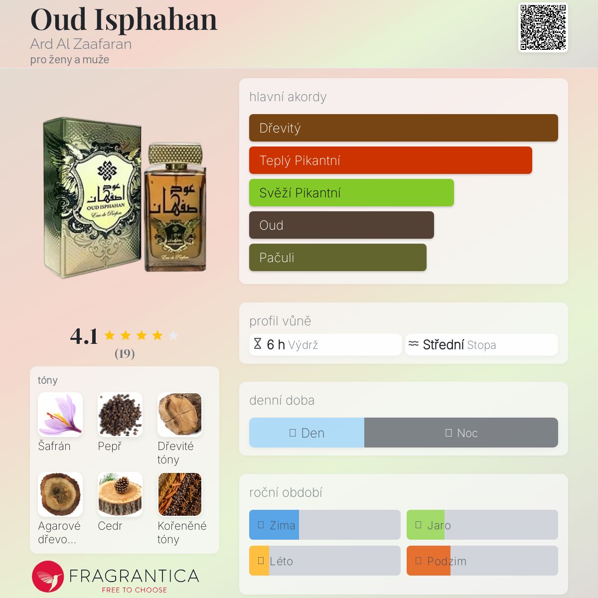 Oud Isphahan podle Ard Al Zaafaran je vůně pro ženy a muže. Vrchní tóny jsou Šafrán, Pepř, Koření, Tymián a Květinové tóny; střední tóny jsouDřevité tóny, Pačuli, Růže a Skořice ; základní tóny jsou Agarové dřevo (oud), Cedr, Santalové dřevo, Jantar (ambra) a Pižmo.