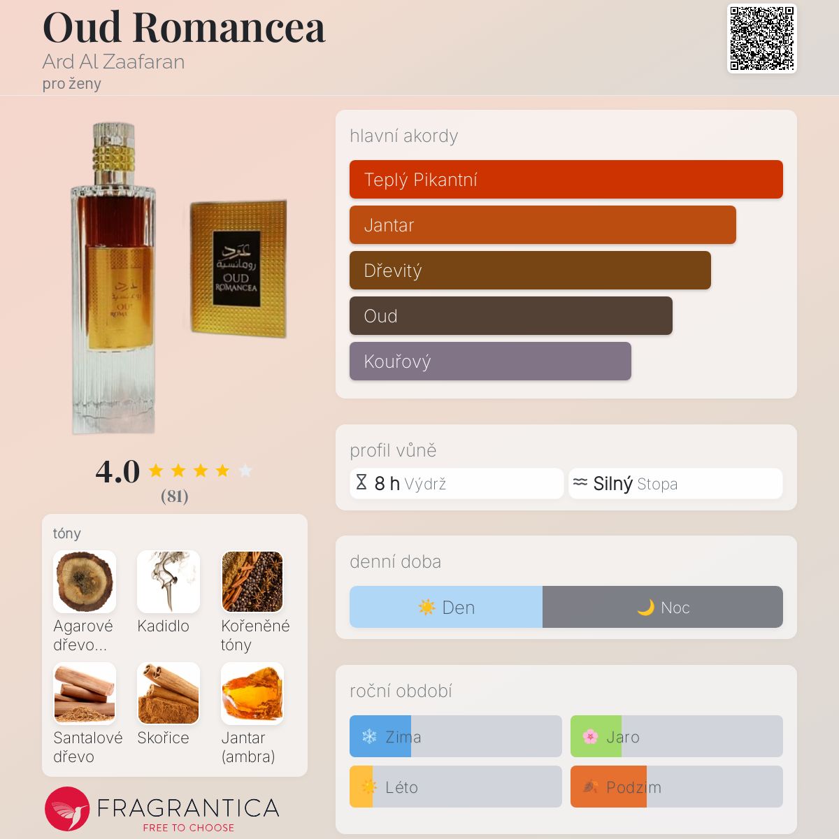 Oud Romancea podle Ard Al Zaafaran je Orientální Woody vůně pro ženy. Vrchní tóny jsou Mandarinka, Černý rybíz a Bergamot; střední tóny jsouKořeněné tóny, Skořice, Gardénie, Ylang-Ylang a Jasmín ; základní tóny jsou Agarové dřevo (oud), Kadidlo, Santalové dřevo, Jantar (ambra) a Pačuli.