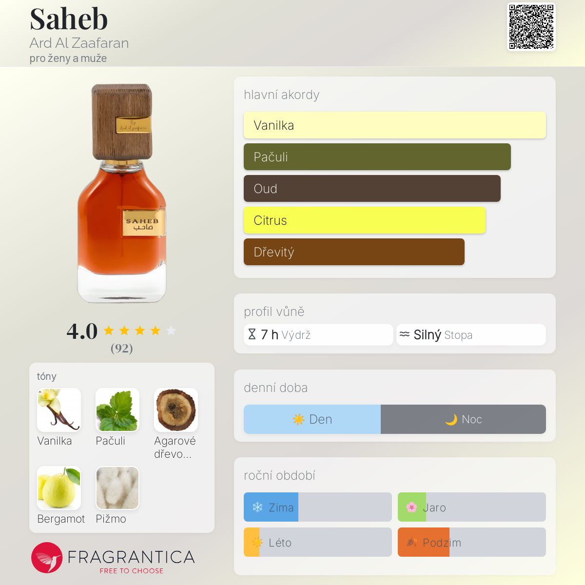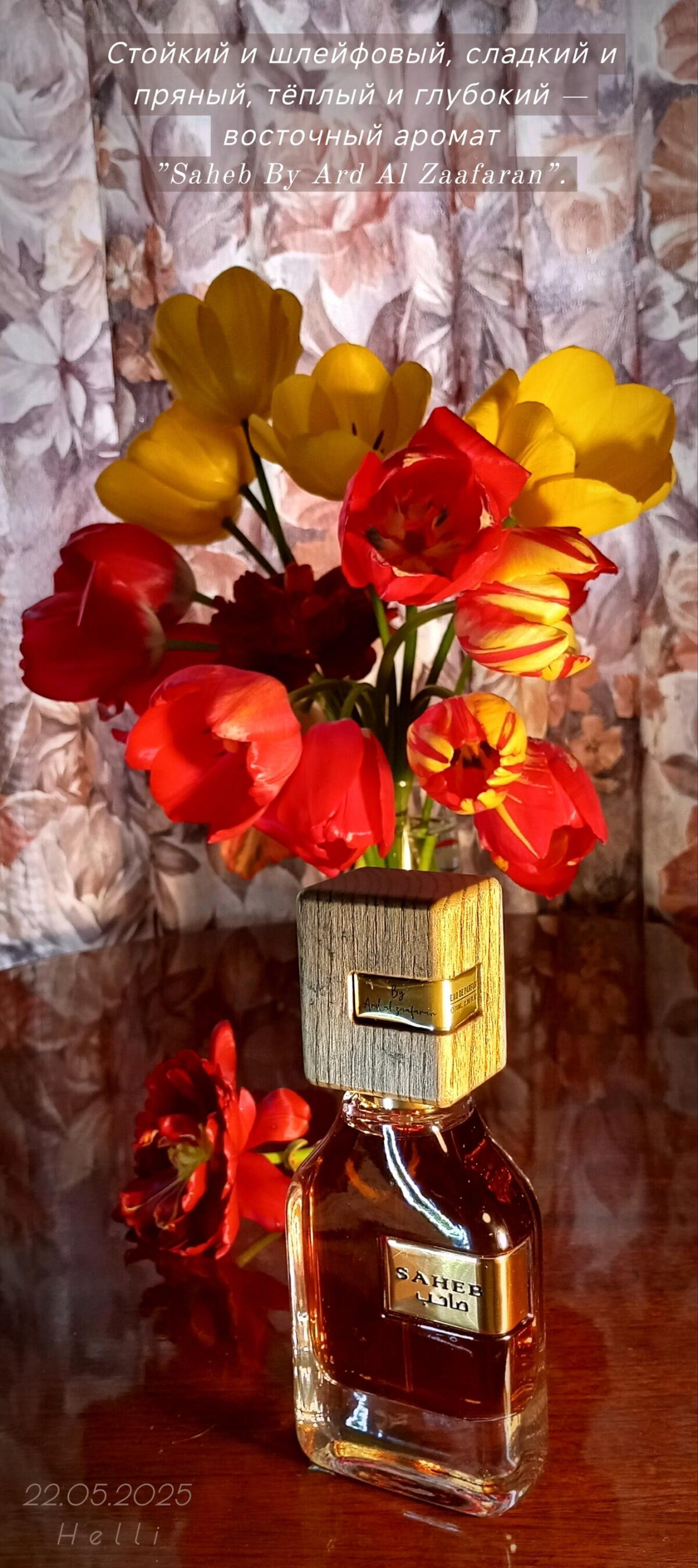 Saheb podle Ard Al Zaafaran je vůně pro ženy a muže. Vrchní tón je Bergamot ; střední tóny jsouVanilka a Pačuli ; základní tóny jsou Agarové dřevo (oud) a Pižmo.