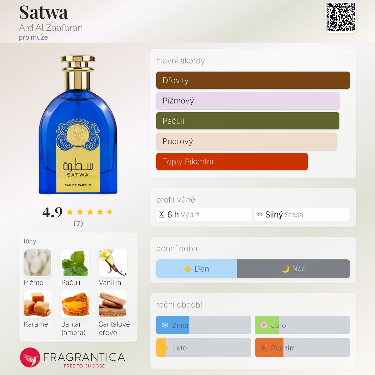 Satwa podle Ard Al Zaafaran je Orientální Vanilla vůně pro muže. Satwa byl/a uveden/a v roce 2018. Vrchní tóny jsou Vanilka a Karamel; střední tóny jsouBílé pižmo a Jantar (ambra) ; základní tóny jsou Pačuli a Santalové dřevo.