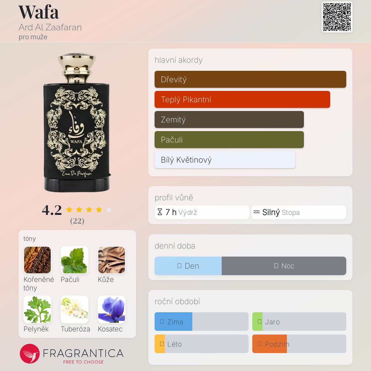 Wafa podle Ard Al Zaafaran je Orientální vůně pro muže. Wafa byl/a uveden/a v roce 2023. Vrchní tóny jsou Kořeněné tóny, Pelyněk, Styrax a Růže; střední tóny jsouKůže, Tuberóza, Kosatec, Cedr a Jasmín ; základní tóny jsou Pačuli, Vetiver, Jantar (ambra), Agarové dřevo (oud) a Bílé pižmo.
