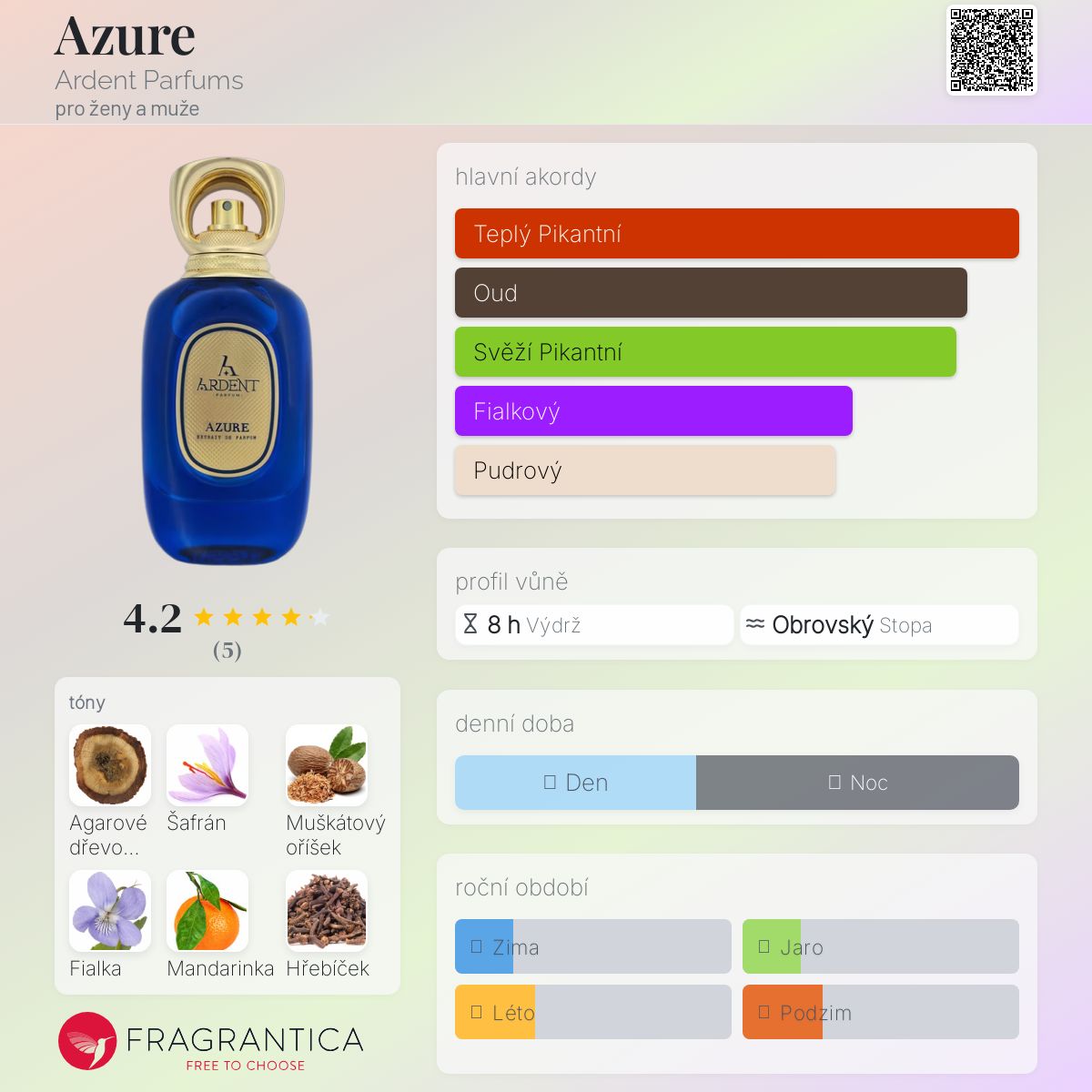 Azure podle Ardent Parfums je Orientální Woody vůně pro ženy a muže. Toto je nová vůně. Azure byl/a uveden/a v roce 2024. Vrchní tóny jsou Šafrán, Muškátový oříšek a Mandarinka; střední tóny jsouFialka, Hřebíček, Vonokvětka a Kmín ; základní tóny jsou Agarové dřevo (oud), Jantar (ambra), Pačuli, Mech a Pižmo.
