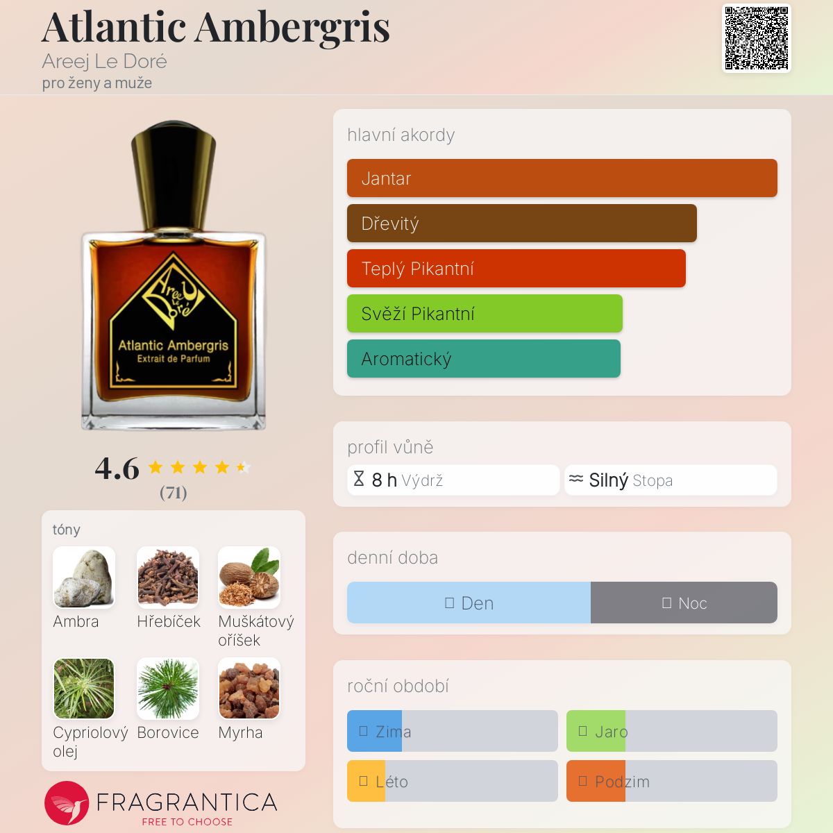 Atlantic Ambergris podle Areej Le Doré je Chypre vůně pro ženy a muže. Atlantic Ambergris byl/a uveden/a v roce 2017. "Nosem" za touto vůní je Russian Adam. Vrchní tóny jsou Borovice, Kardamom a Bergamot; střední tóny jsouAmbra, Hřebíček, Muškátový oříšek, Magnólie champaca, Fazole tonka, Jasmín Sambac a Ylang-Ylang ; základní tóny jsou Cypriolový olej, Myrha, Labdanum, Fialkový list, Dubový mech a Kořen orris.