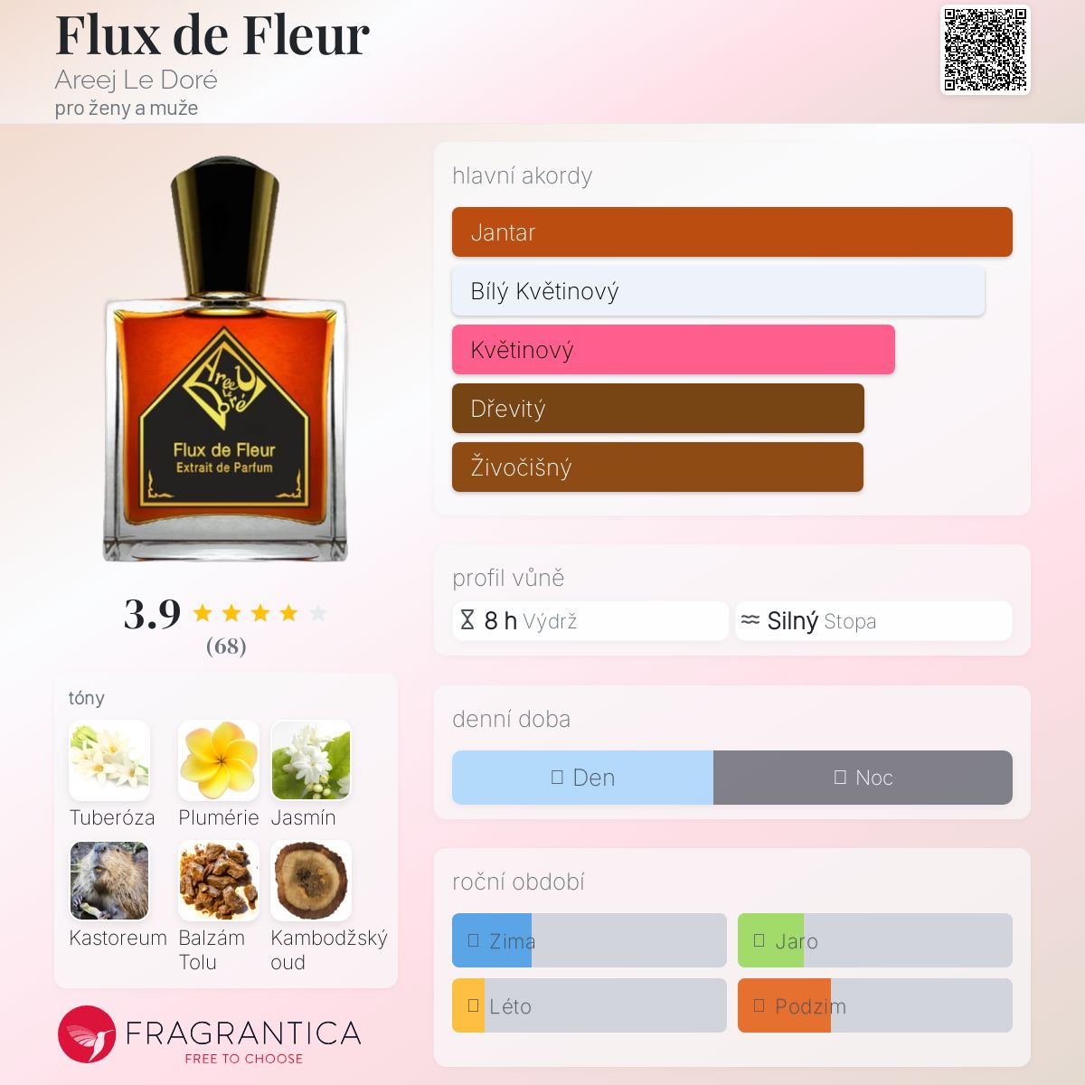 Flux de Fleur podle Areej Le Doré je Floral Fruity vůně pro ženy a muže. Flux de Fleur byl/a uveden/a v roce 2017. "Nosem" za touto vůní je Russian Adam. Vrchní tóny jsou Olibanum a Růžový grapefruit; střední tóny jsouTuberóza, Plumérie, Jasmín Sambac, Kambodžský oud, Agarové dřevo (oud) a Jantar (ambra) ; základní tóny jsou Kastoreum, Balzám Tolu, Hena, Benzoin, Přírodní pižmo, Modrý lotos, Zimolez a Vetiver.