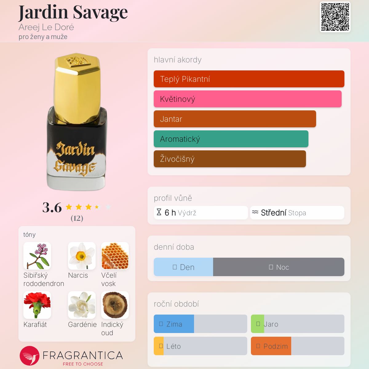 Jardin Savage podle Areej Le Doré je Orientální Spicy vůně pro ženy a muže. Toto je nová vůně. Jardin Savage byl/a uveden/a v roce 2025. Vrchní tón je Sibiřský rododendron ; střední tóny jsouNarcis, Karafiát a Gardénie ; základní tóny jsou Včelí vosk, Indický oud, List hřebíčku, Kmín, Koření, Cibetka, Kakao, Dubový mech a Vetiver.