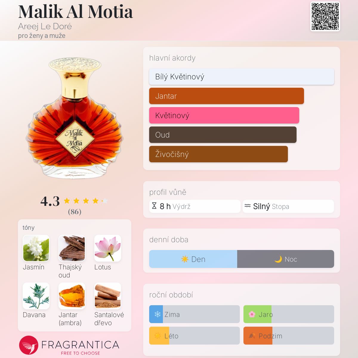 Malik Al Motia podle Areej Le Doré je Floral Woody Musk vůně pro ženy a muže. Malik Al Motia byl/a uveden/a v roce 2022. "Nosem" za touto vůní je Russian Adam. Vrchní tóny jsou Jasmín, Modrý lotos a Davana; střední tóny jsouJasmín Sambac, Thajský oud a Santalové dřevo ; základní tóny jsou Jantar (ambra), Santalové dřevo, Benzoin a Peruánský balzám.