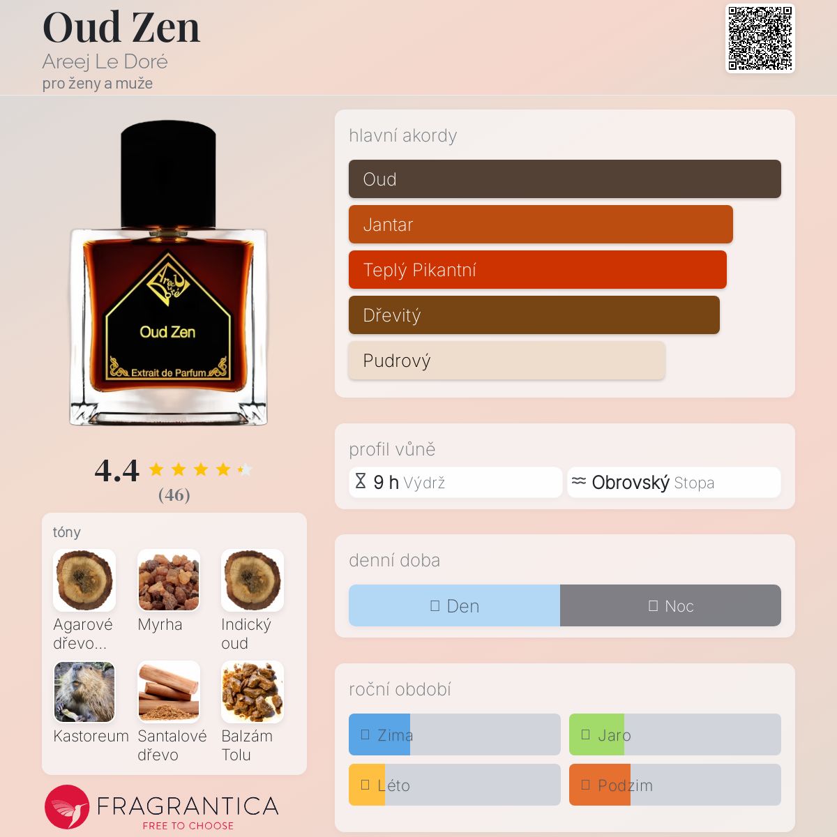 Oud Zen podle Areej Le Doré je Woody vůně pro ženy a muže. Oud Zen byl/a uveden/a v roce 2017. "Nosem" za touto vůní je Russian Adam. Vrchní tón je Agarové dřevo (oud) ; střední tóny jsouIndický oud a Indický šafrán ; základní tóny jsou Myrha, Kastoreum, Santalové dřevo, Balzám Tolu, Vetiver a Syntetická cibetka.