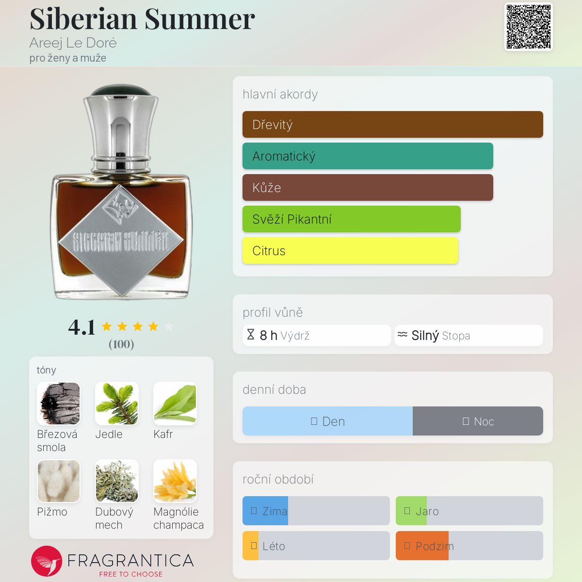 Siberian Summer podle Areej Le Doré je Chypre vůně pro ženy a muže. Siberian Summer byl/a uveden/a v roce 2019. "Nosem" za touto vůní je Russian Adam. Vrchní tóny jsou Březová smola, Jedle balzámová, Kafr, Bergamot a Limetka; střední tóny jsouMagnólie champaca, Galbanum a Jasmín ; základní tóny jsou Pižmo, Dubový mech, Cedr, Vetiver, Vanilka a Jantar (ambra).
