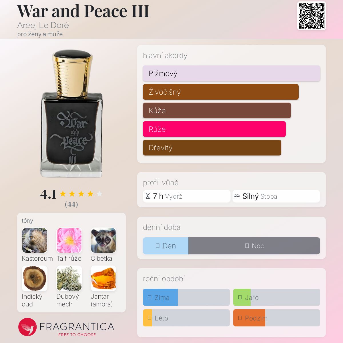 War and Peace III podle Areej Le Doré je Leather vůně pro ženy a muže. Toto je nová vůně. War and Peace III byl/a uveden/a v roce 2025. "Nosem" za touto vůní je Russian Adam. Vrchní tóny jsou Jantar (ambra) a Pryskyřice; střední tóny jsouTaif růže, Orris, Pačuli, Růže a Bílá růže ; základní tóny jsou Kastoreum, Syntetická cibetka, Cibetka, Indický oud, Pižmo, Přírodní pižmo, Dubový mech, Jantar (ambra), Pryskyřice, Ambra a Vetiver.