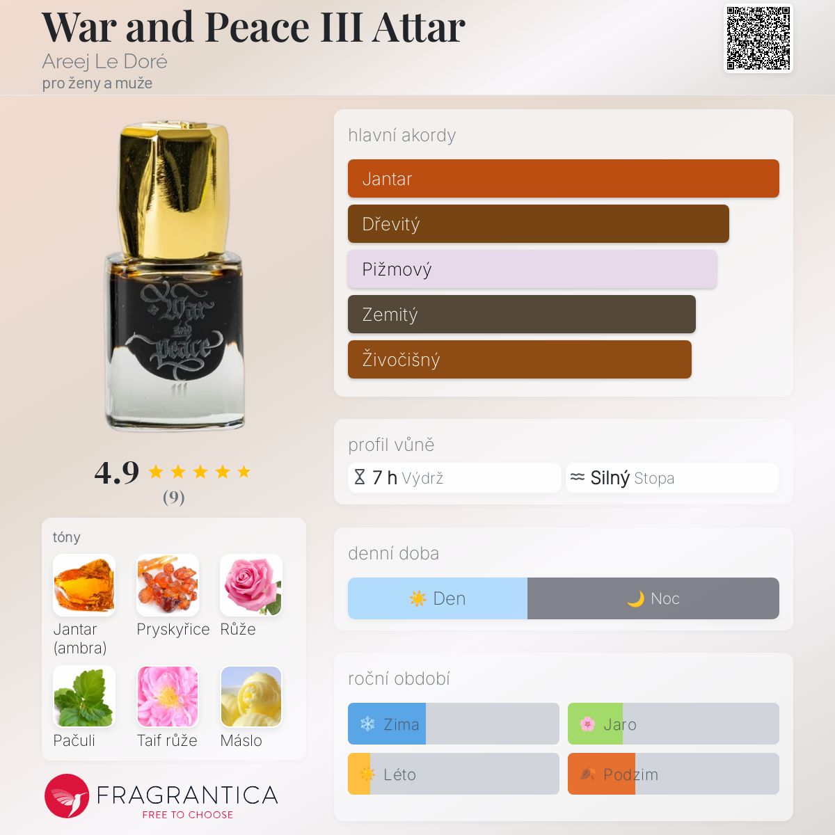 War and Peace III Attar podle Areej Le Doré je vůně pro ženy a muže. Toto je nová vůně. War and Peace III Attar byl/a uveden/a v roce 2025. "Nosem" za touto vůní je Russian Adam. Vrchní tóny jsou Jantar (ambra) a Pryskyřice; střední tóny jsouBílá růže, Pačuli, Taif růže, Máslo a Orris ; základní tóny jsou Syntetická cibetka, Indický oud, Ambra, Kastoreum, Dubový mech, Vetiver, Jantar (ambra), Cibetka, Pryskyřice a Přírodní pižmo.