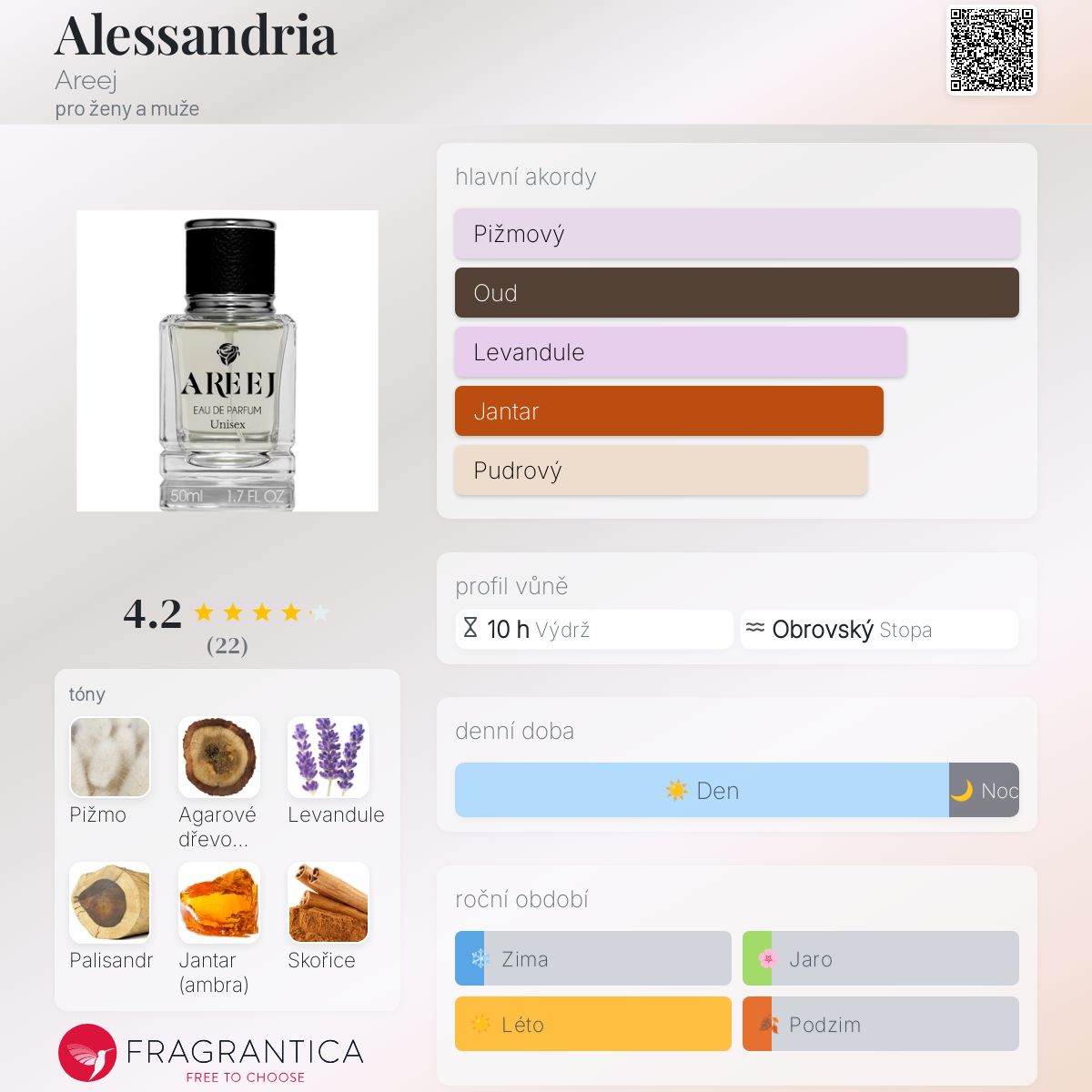 Alessandria podle Areej je Orientální Woody vůně pro ženy a muže. Alessandria byl/a uveden/a v roce 2025. Vrchní tóny jsou Levandule, Palisandr, Skořice a Jablko; střední tóny jsouKonvalinka, Cedr a Růže ; základní tóny jsou Pižmo, Agarové dřevo (oud), Jantar (ambra), Santalové dřevo a Vanilka.