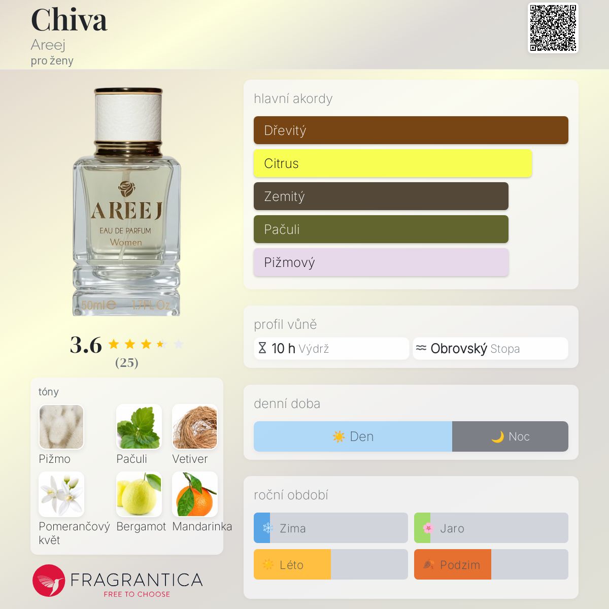 Chiva podle Areej je Orientální Floral vůně pro ženy. Chiva byl/a uveden/a v roce 2025. Vrchní tóny jsou Pomerančový květ, Bergamot, Mandarinka a Pomeranč; střední tóny jsouTurecká růže, Ylang-Ylang, Jasmín a Mimóza ; základní tóny jsou Bílé pižmo, Pačuli, Vetiver, Fazole tonka a Vanilka.