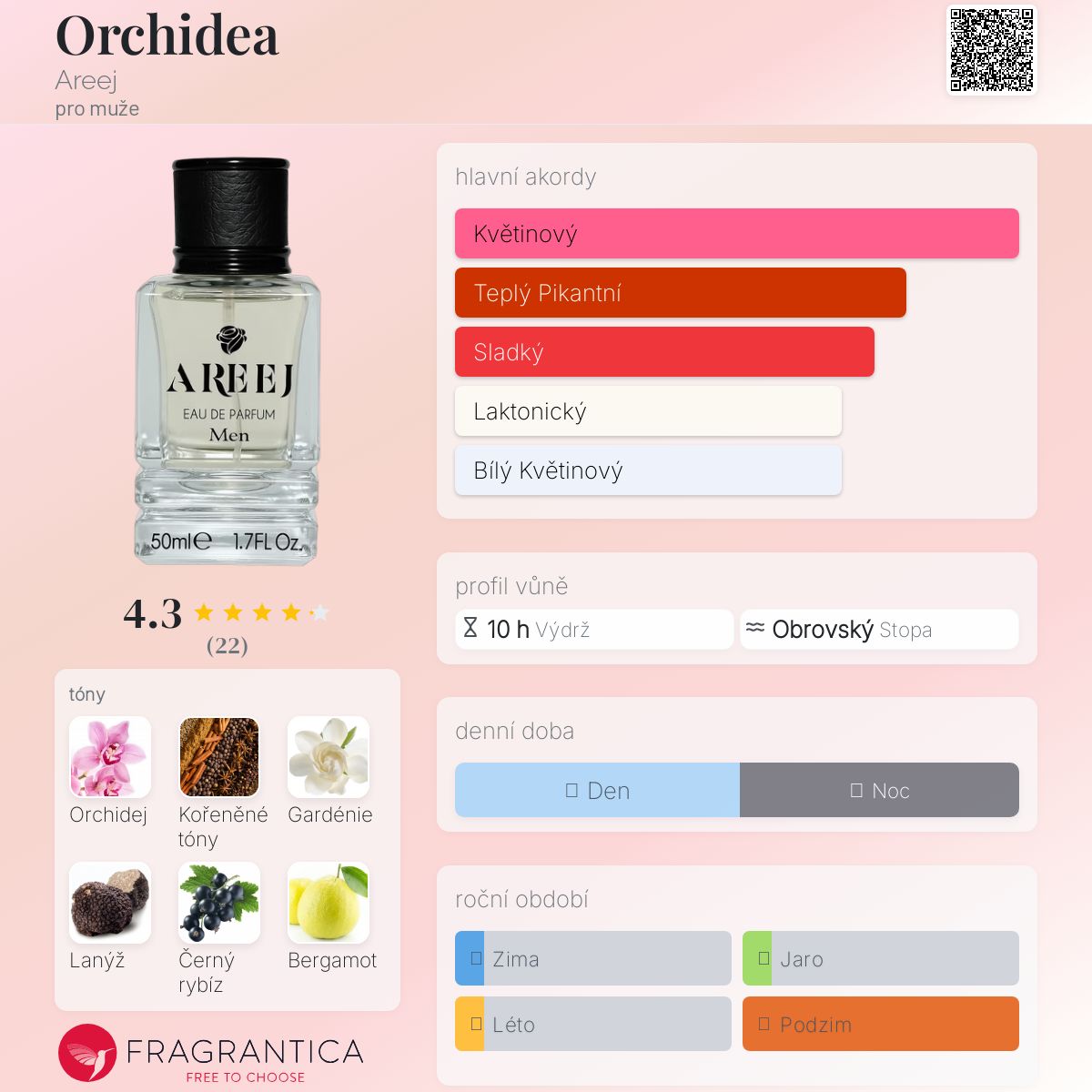 Orchidea podle Areej je Orientální Floral vůně pro muže. Orchidea byl/a uveden/a v roce 2025. Vrchní tóny jsou Gardénie, Lanýž, Černý rybíz, Bergamot, Mandarinka, Jasmín a Citrón; střední tóny jsouOrchidej, Koření, Gardénie a Ovocné tóny ; základní tóny jsou Jasmín a Lotus.