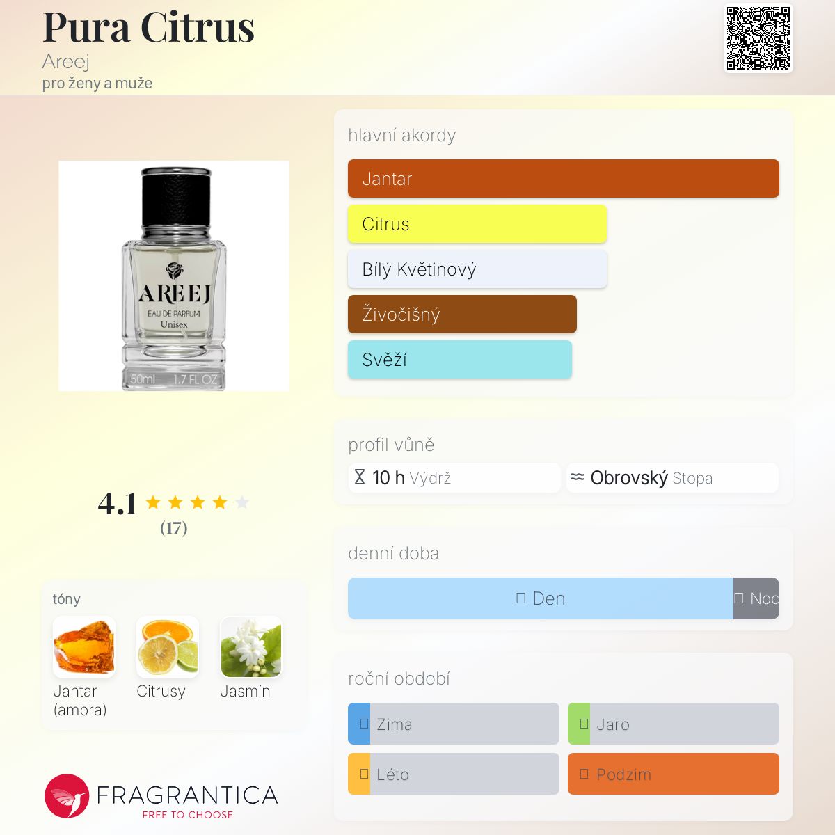 Pura Citrus podle Areej je Citrus vůně pro ženy a muže. Pura Citrus byl/a uveden/a v roce 2025. Vrchní tón je Citrusy ; střední tón jeJasmín ; základní tón je Jantar (ambra).