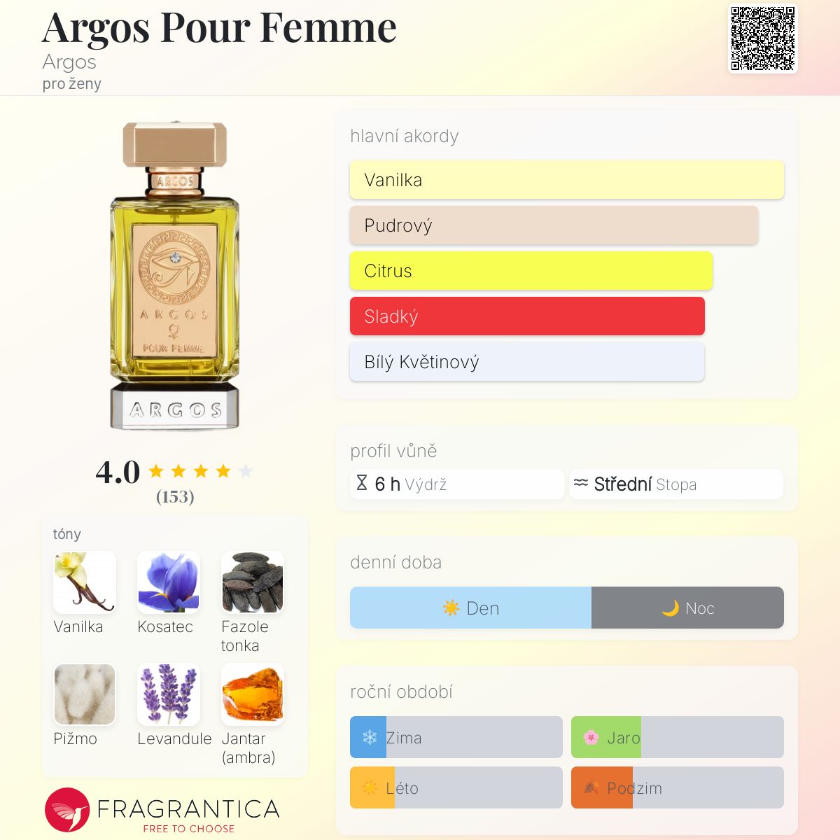 Argos Pour Femme podle Argos je Orientální Floral vůně pro ženy. Argos Pour Femme byl/a uveden/a v roce 2017. "Nosem" za touto vůní je Christian Petrovich. Vrchní tóny jsou Marocký citron, Fialkový list, Bergamot, Pomerančový květ a Zázvor; střední tóny jsouKosatec, Levandule, Růžový pepř, Jasmín, Konvalinka a Bulharská růže ; základní tóny jsou Vanilka, Fazole tonka, Bílé pižmo, Jantar (ambra), Ylang-Ylang a Santalové dřevo.