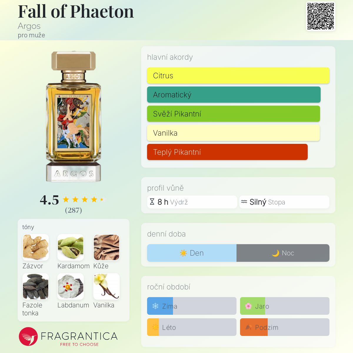 Fall of Phaeton podle Argos je Orientální Spicy vůně pro muže. Toto je nová vůně. Fall of Phaeton byl/a uveden/a v roce 2024. Vrchní tóny jsou Zázvor, Kardamom, Citrón, Bergamot a Růžový pepř; střední tóny jsouLabdanum, Levandule a Agarové dřevo (oud) ; základní tóny jsou Kůže, Fazole tonka, Vanilka a Pižmo.