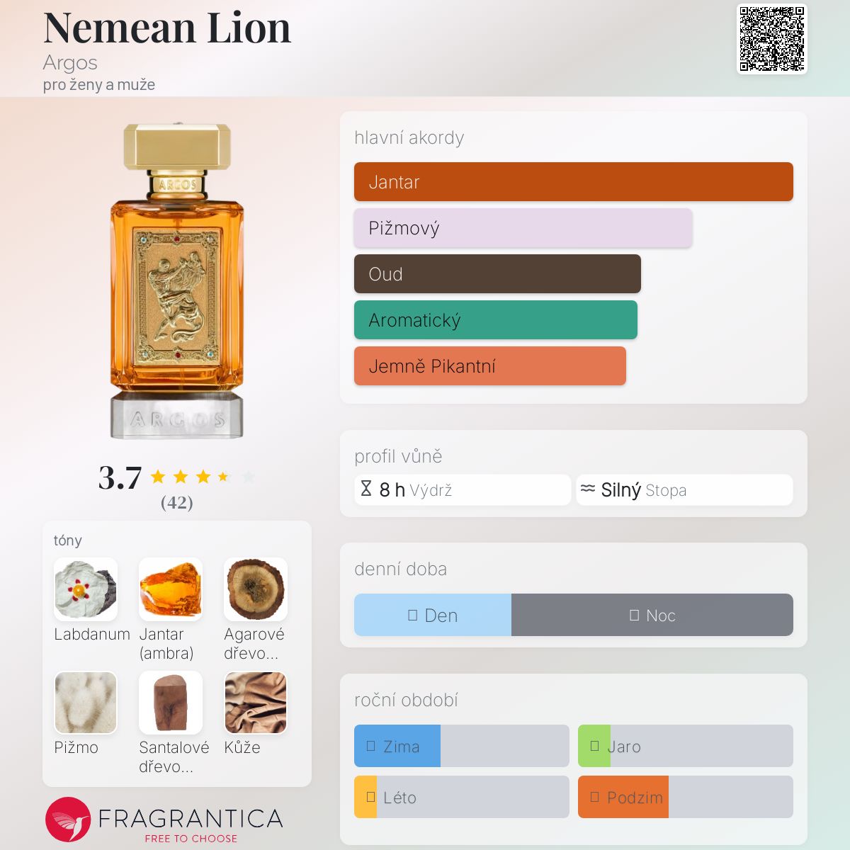 Nemean Lion podle Argos je Leather vůně pro ženy a muže. Nemean Lion byl/a uveden/a v roce 2022. Vrchní tóny jsou Labdanum, Dubový mech, Borovice a Citrusy; střední tóny jsouRůžový pepř, Šalvěj muškátová, Jalovcové bobulky, Jasmín a Koriandr ; základní tóny jsou Jantar (ambra), Agarové dřevo (oud), Pižmo, Santalové dřevo Mysore a Kůže.