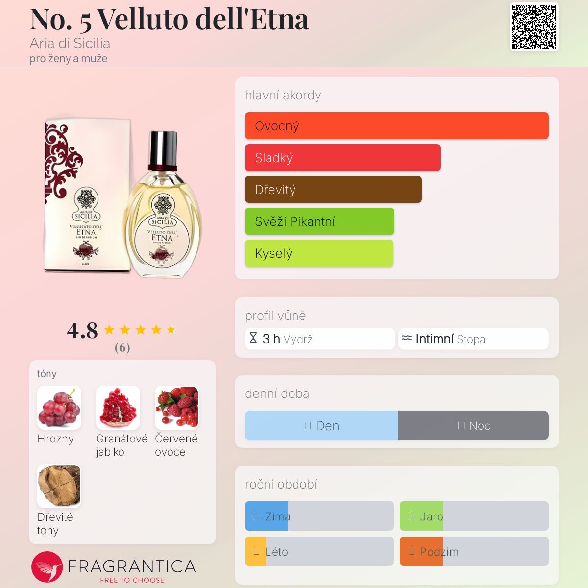 No. 5 Velluto dell'Etna podle Aria di Sicilia je Aromatic Fruity vůně pro ženy a muže. No. 5 Velluto dell'Etna byla spuštěna během 2010. Vrchní tón je Granátové jablko ; střední tóny jsouHrozny a Červené ovoce ; základní tón je Dřevité tóny.