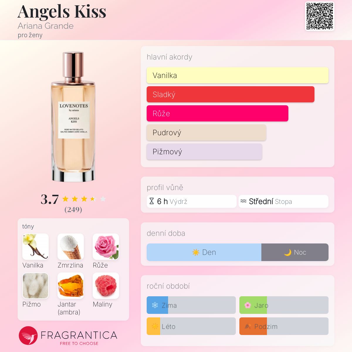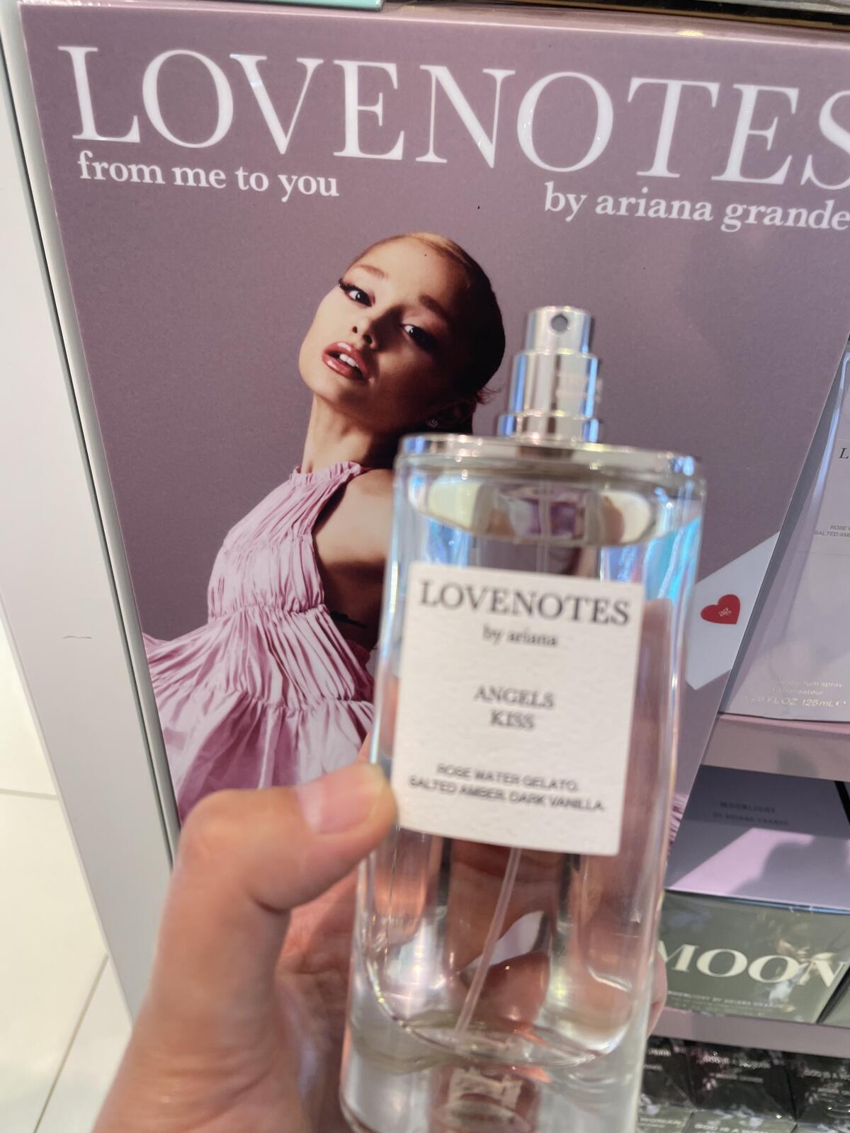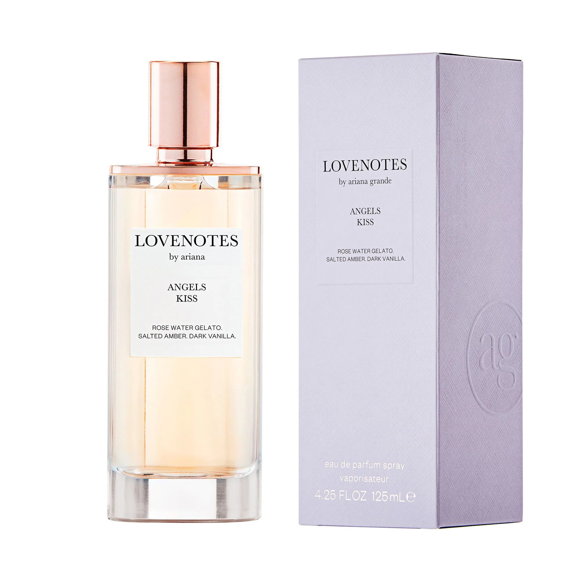 Angels Kiss podle Ariana Grande je Floral Fruity vůně pro ženy. Toto je nová vůně. Angels Kiss byl/a uveden/a v roce 2024. Vrchní tóny jsou Zmrzlina, Růžová voda, Maliny a Kokos; střední tóny jsouRůže a Pižmo ; základní tóny jsou Vanilka, Jantar (ambra) a Bílé dřevo.
