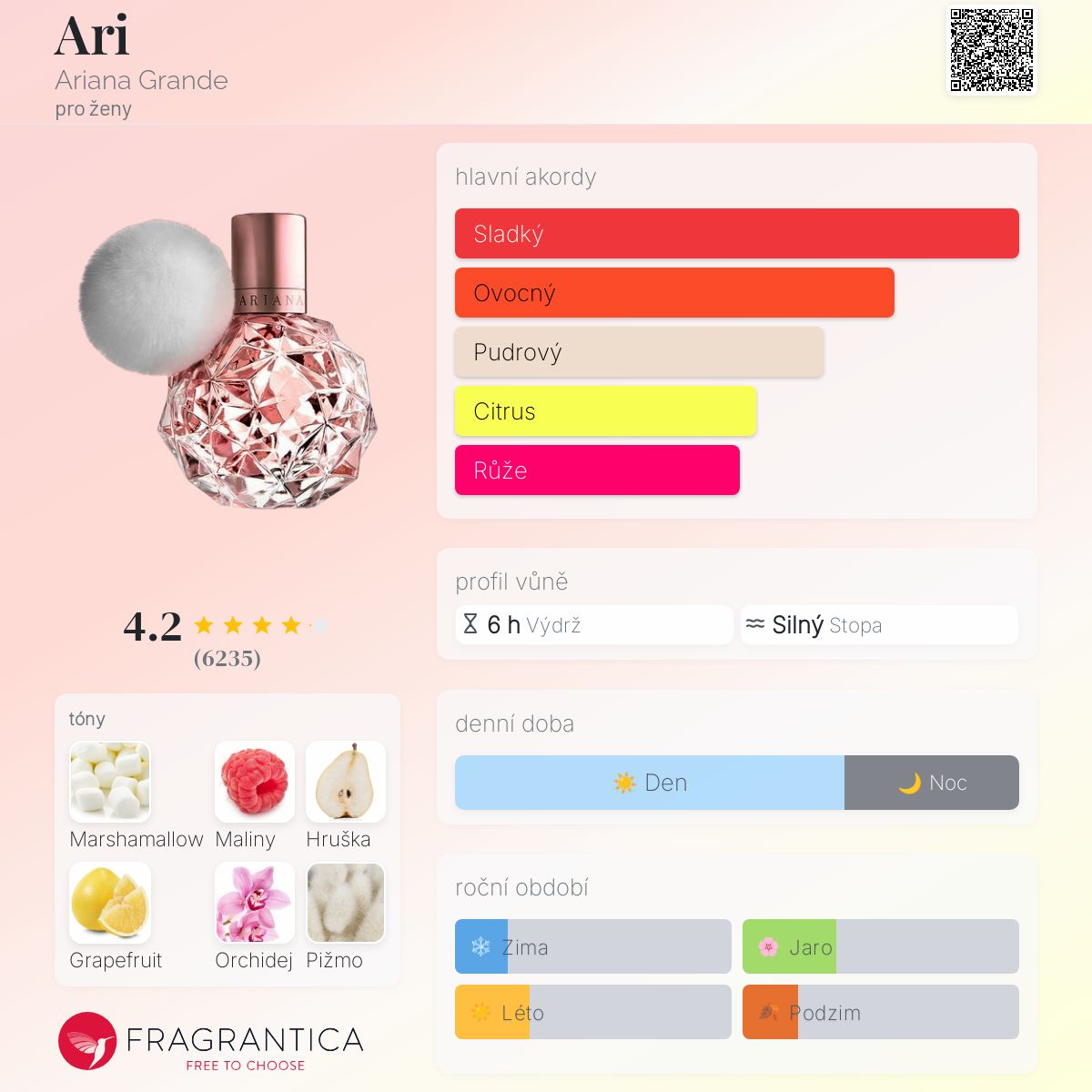 Ari podle Ariana Grande je Floral Fruity Gourmand vůně pro ženy. Ari byl/a uveden/a v roce 2015. Vrchní tóny jsou Maliny, Hruška a Grapefruit; střední tóny jsouVanilková orchidej, Růže a Konvalinka ; základní tóny jsou Marshamallow, Pižmo a Dřevité tóny.